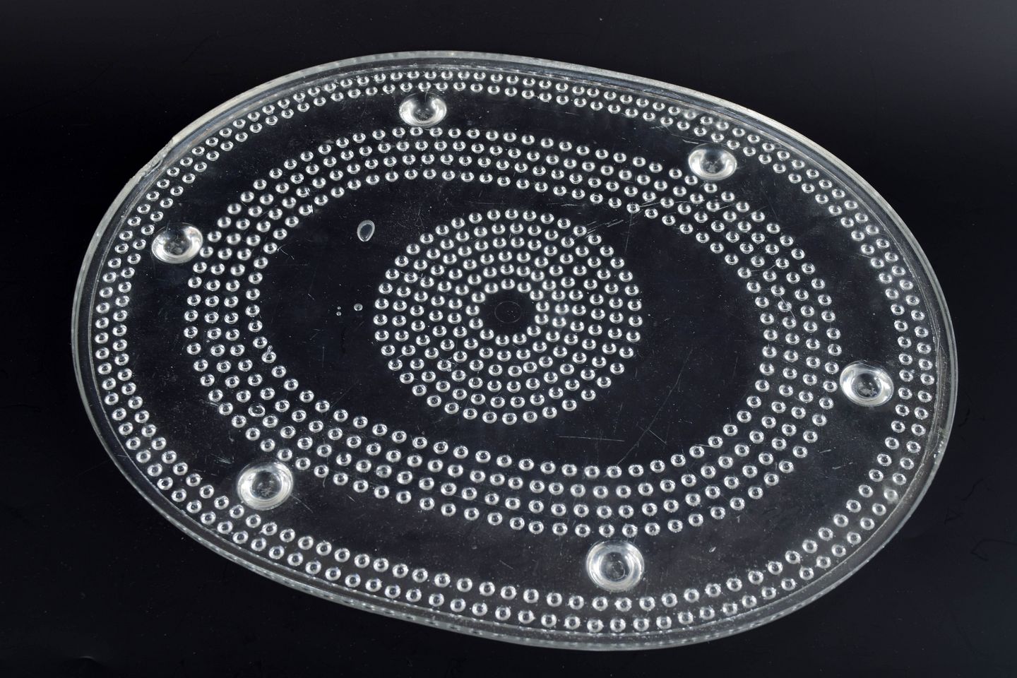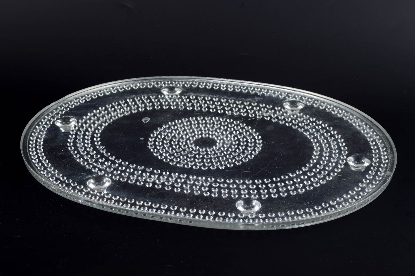 Large oval tray in clear art glass with concentric rings of knop relief and raised feet. Pressed glass.