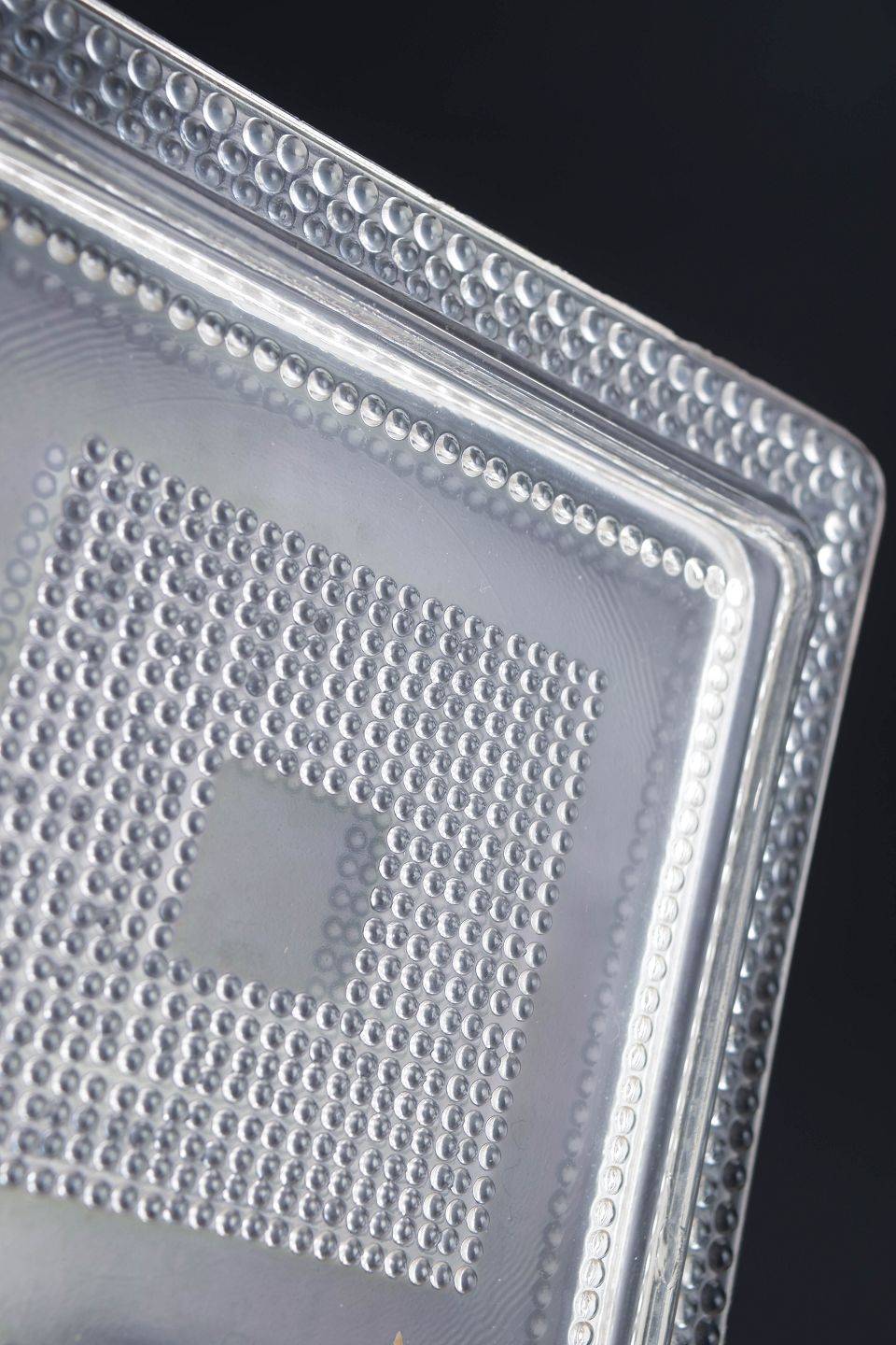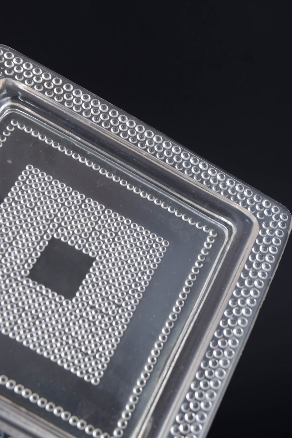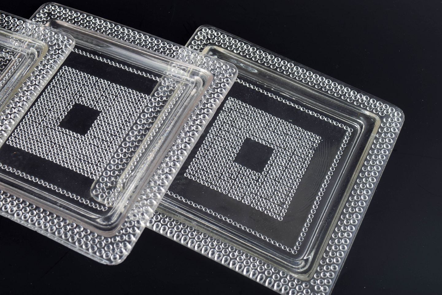 Sæt på fire kvadratiske tallerkener i klart kunstglas med geometrisk relief og markeret midterfelt. Fremstillet i presset glas.