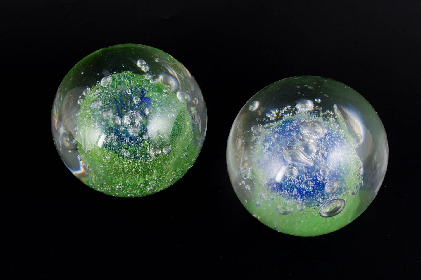 To Kugleformede brevpressere i klart kunstglas med indkapslede grønne og blå farvefelter samt kontrollerede luftbobler.