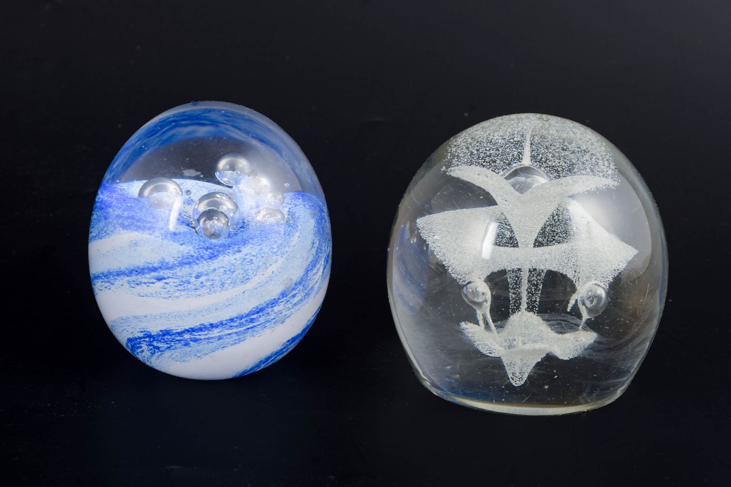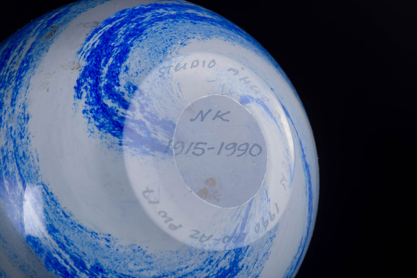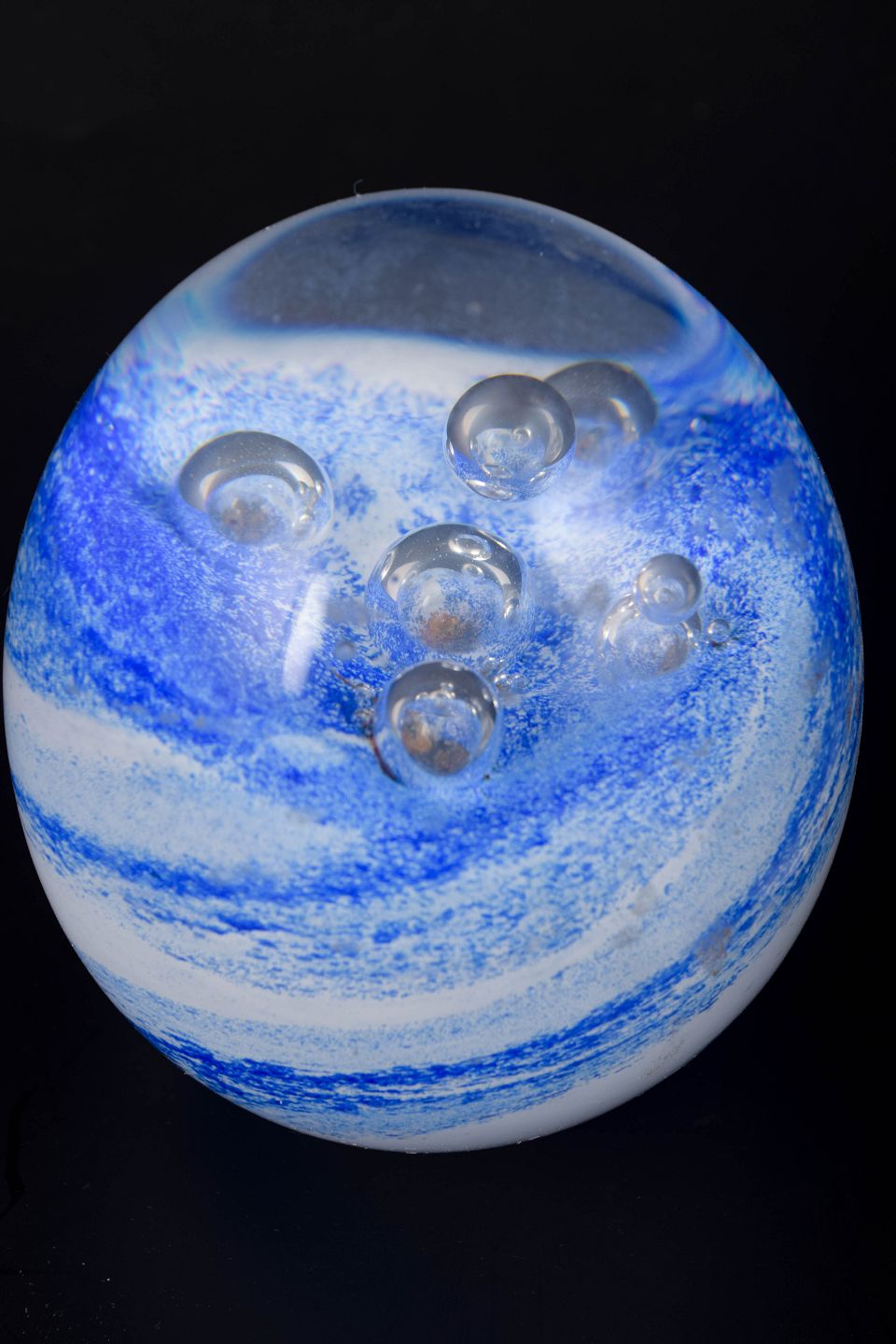 Organically shaped paperweight in clear art glass with internal blue and white veils and encapsulated air bubbles. Signed to the base “Studio Åhus, NK 1915–1990”.