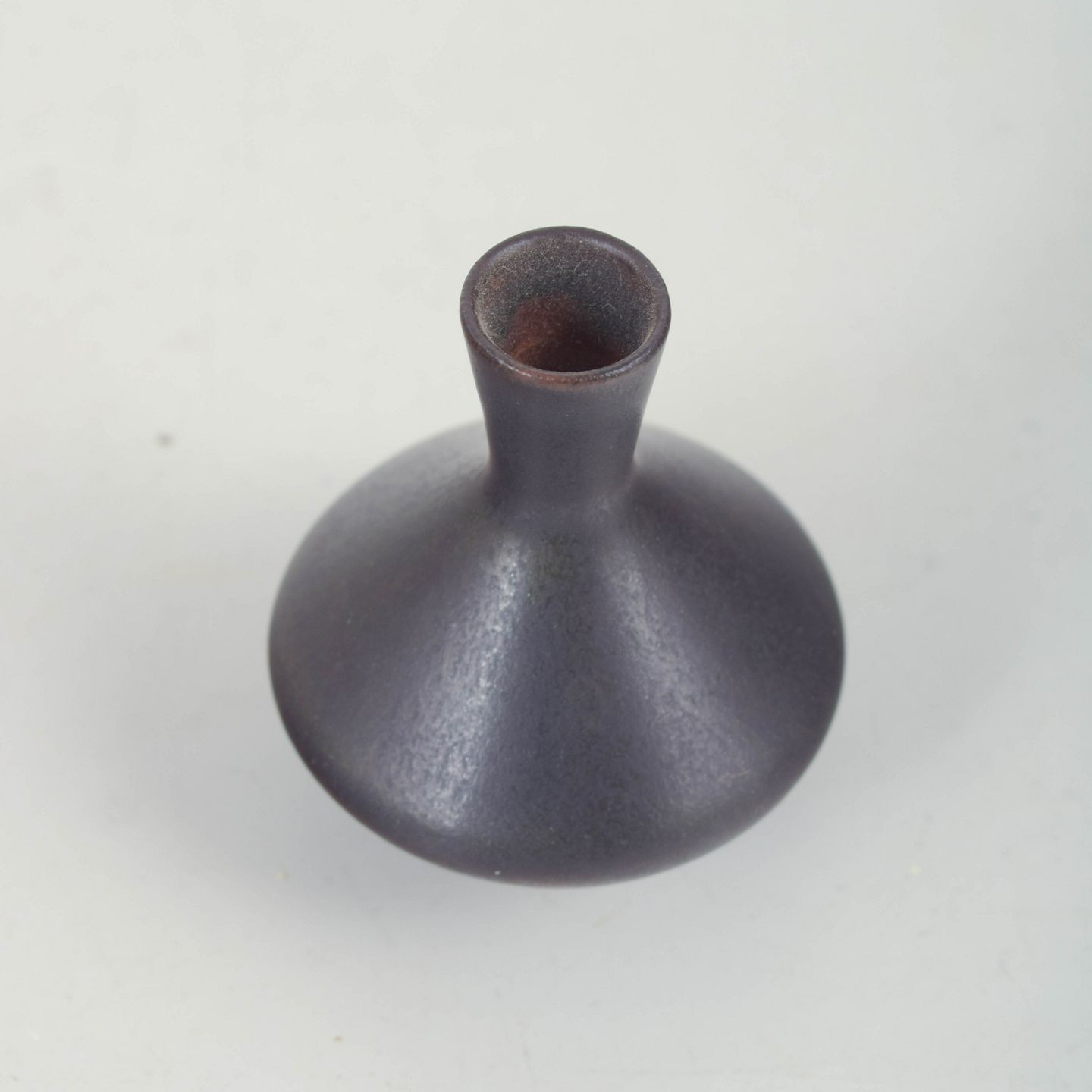 Miniaturevase i stentøj med mat, mørk violetgrå glasur, markant bug og smal, opadtrukket hals. Signeret. Undersiden annulleret med én indridset streg.