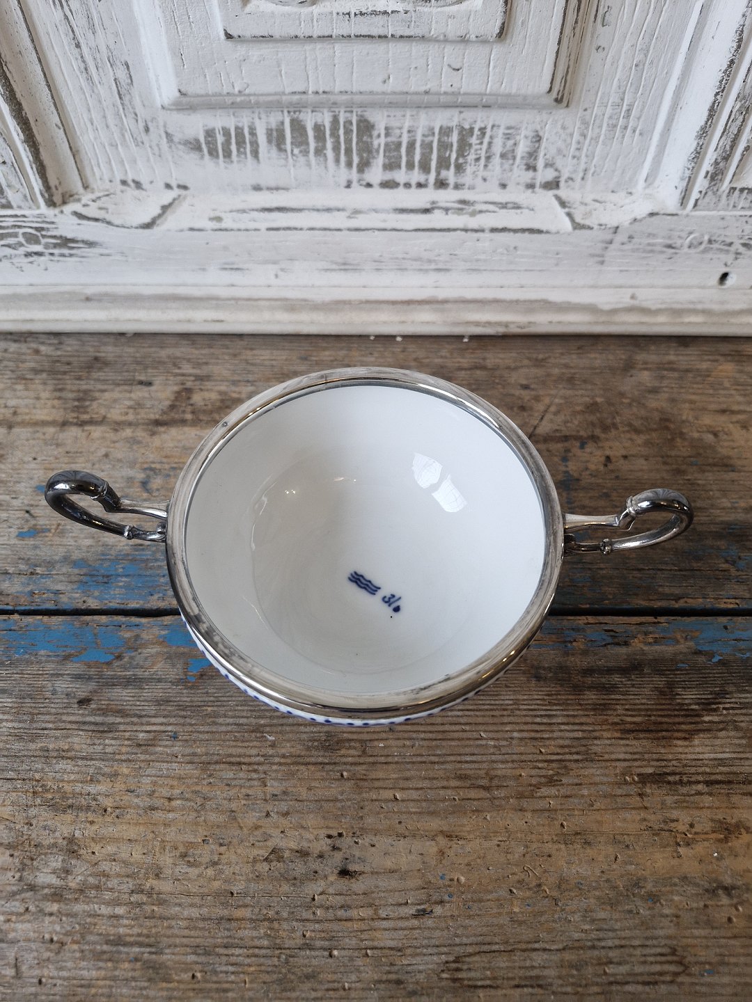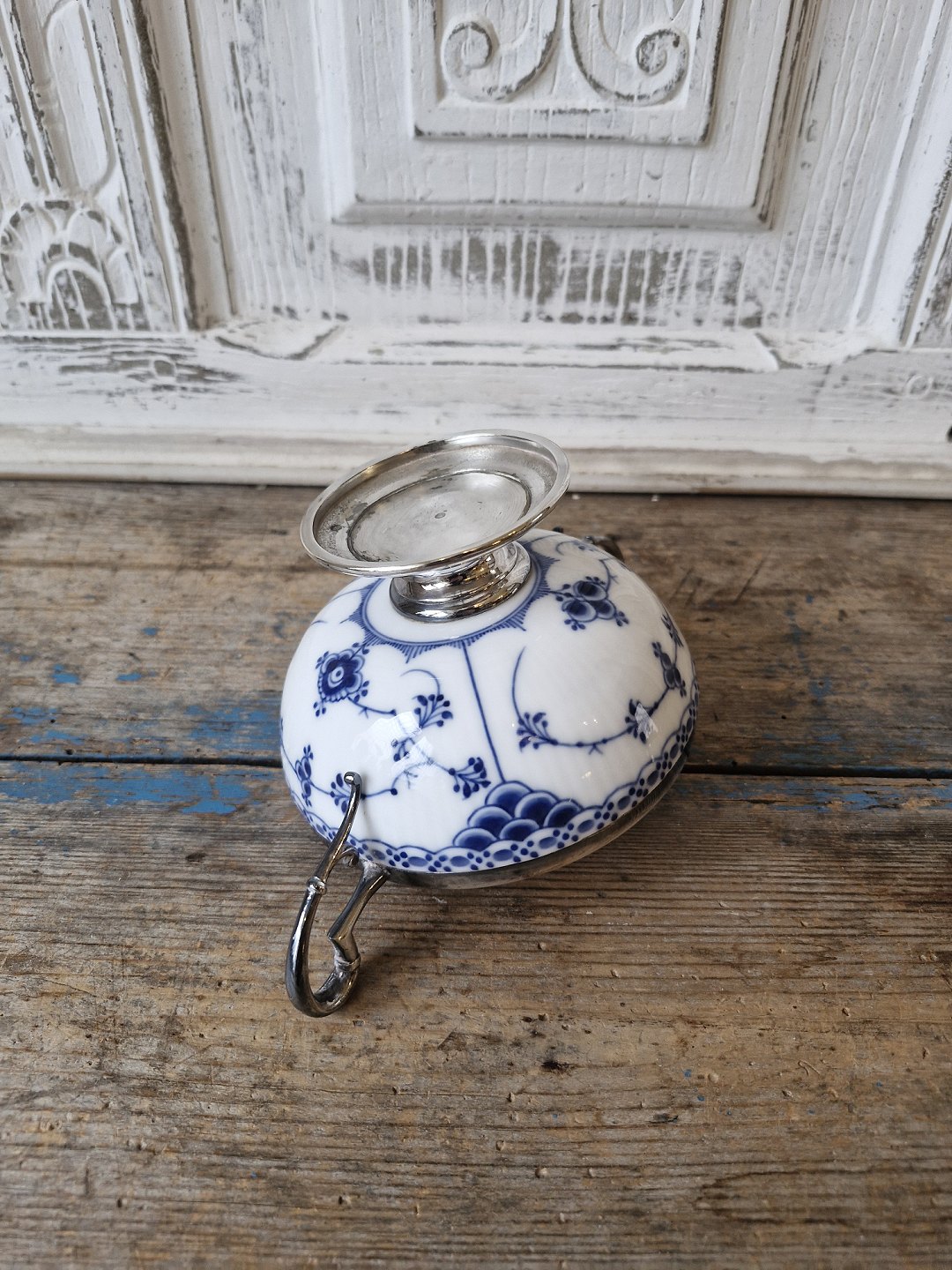 Royal Copenhagen Musselmalet halvblonde sukkerskål med forsølvet montering.