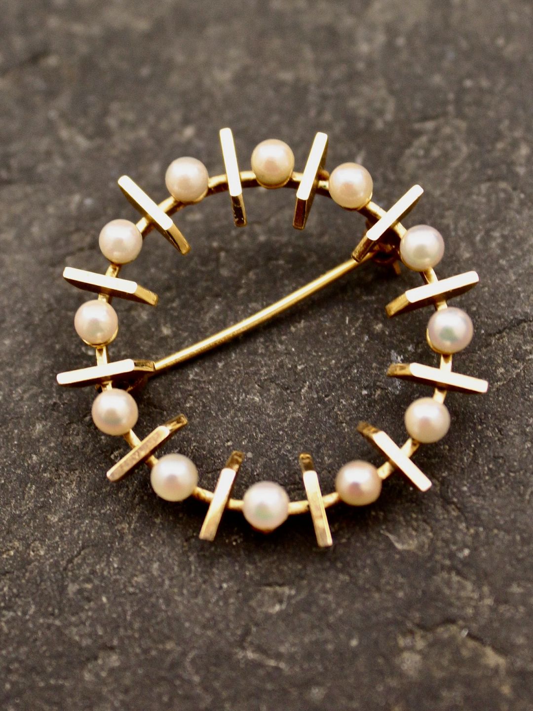 14 karat guld broche med ægte perler D. 3,2 cm. fra hofjuveler B Hertz København emne nr. 631867