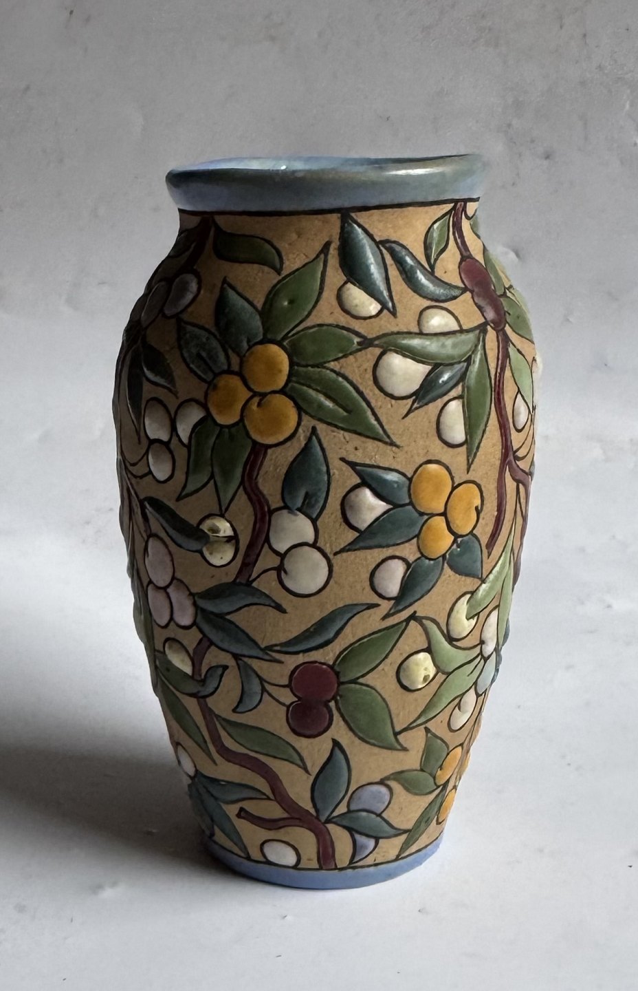 Arguado Toledo vase i keramik med farverig emalje blad og bær dekoration rundt om vasen. Grundlæggeren af dette produkt José Aguado Villalba (1919-2007) havde en mangeårig produktion af keramik i lignende stil fra midten af 1960’erne til i slutningen af 1980’erne i Toledo i Spanien. Vasen er 10,7 cm høj.