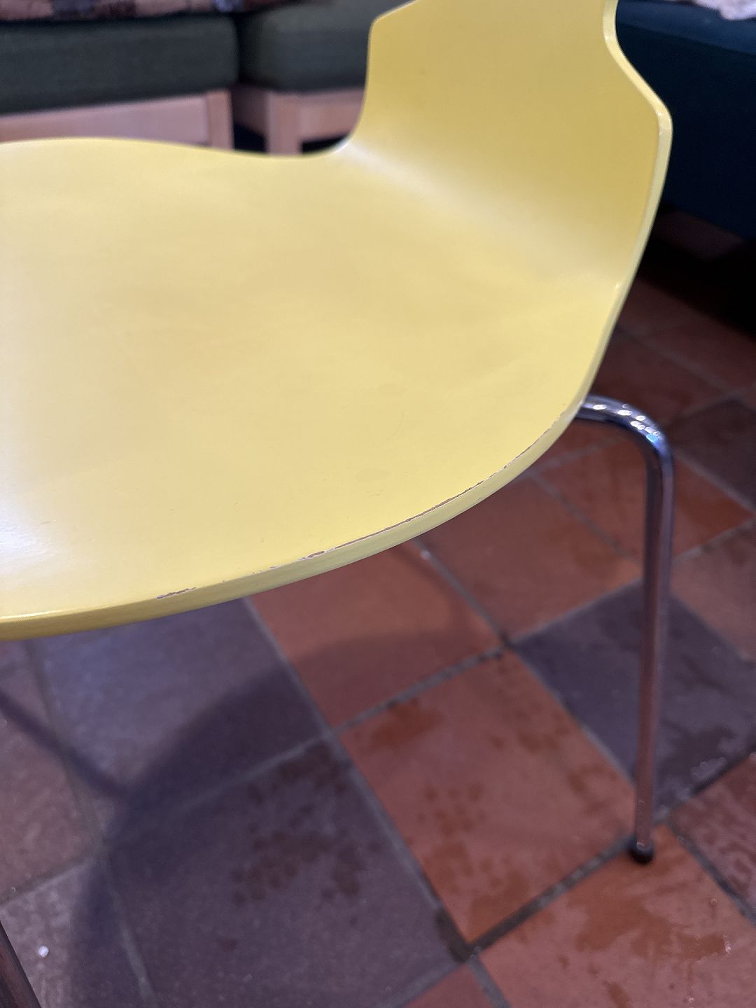 Arne Jacobsen Myrestol gul malet stel i forkromet metal.