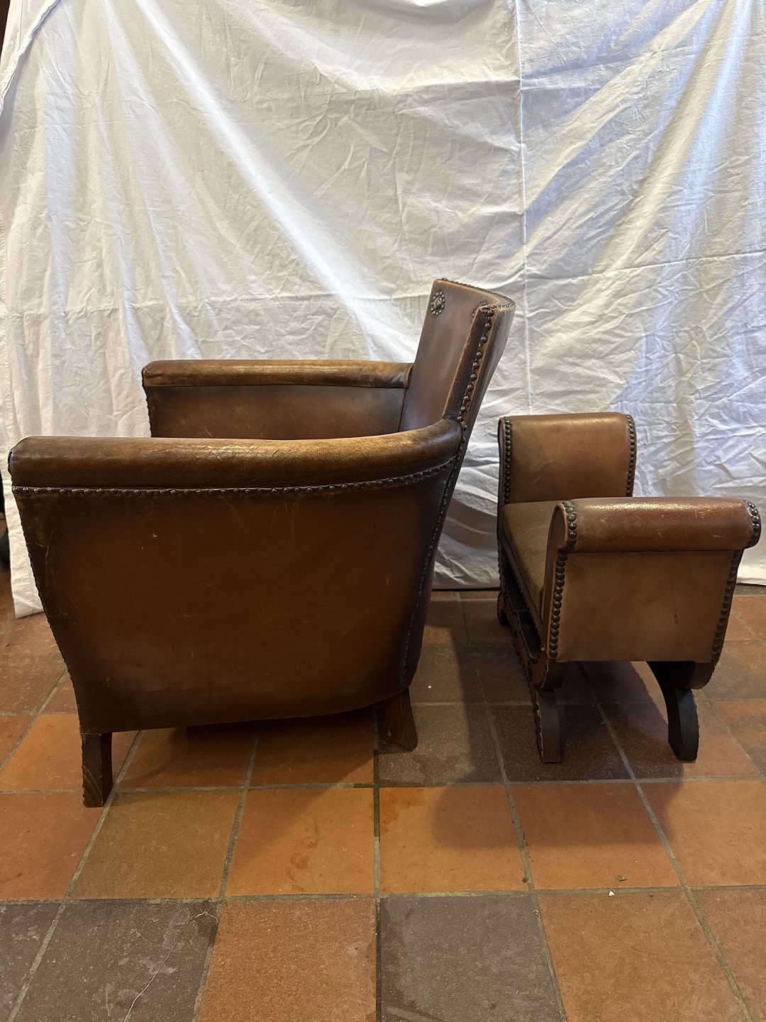 Otto Schulz lænestol i søm beslået patineret skind m. pude i stof. Samt tilhørende skammel i søm beslået skind m. sæde i velour betræk.