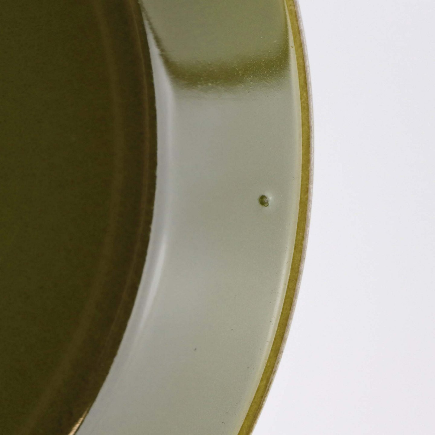 Fremstår med ujævnhed i glasuren samt mindre brunering under glasuren.