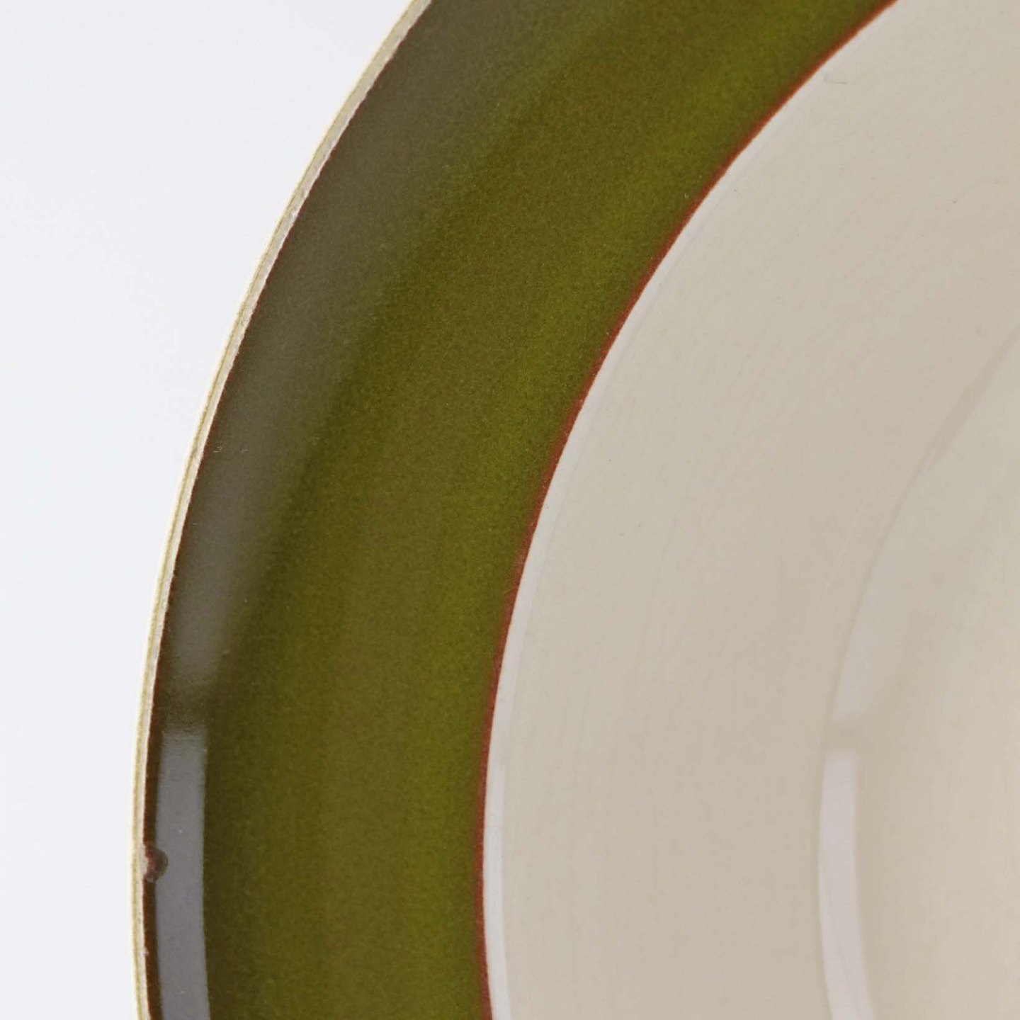 Flaskegrøn fajancestel i Prunella stelform med inderside i hvid glasur og tynd rød kant stribe.