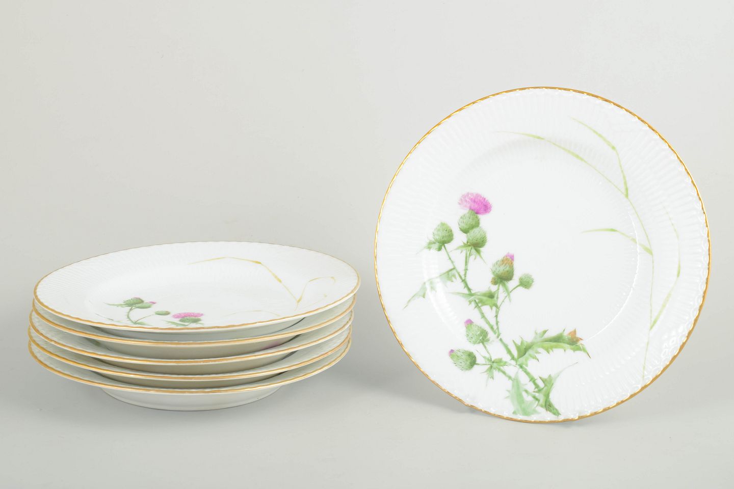 Sæt af seks middagstallerkener i håndmalet porcelæn fra Tidsel serien. Dekoreret med naturalistisk tidselmotiv i grønne og rosa nuancer samt forgyldt kant. Første sortering.