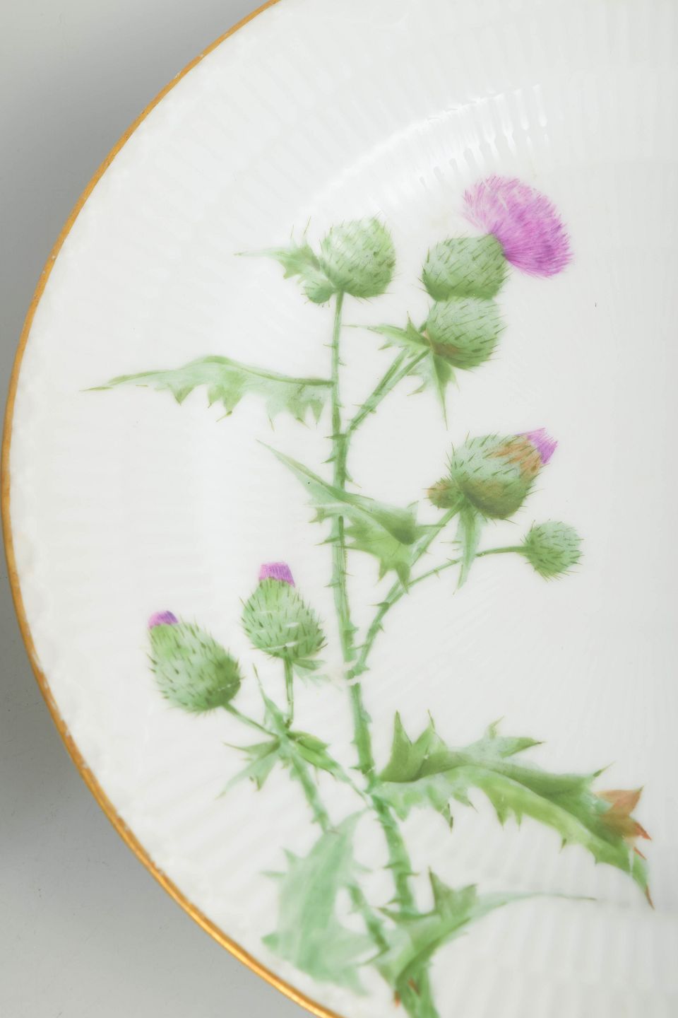 Royal Copenhagen blev grundlagt i 1775 i København under kongelig bevilling. Fabrikken er internationalt anerkendt for sit håndmalede porcelæn og høje kunstneriske kvalitet. I slutningen af 1800-tallet og omkring 1900 udviklede fabrikken en række naturalistiske dekorationer, herunder Tidsel, som er kendetegnet ved botanisk præcision og fine forgyldte detaljer.