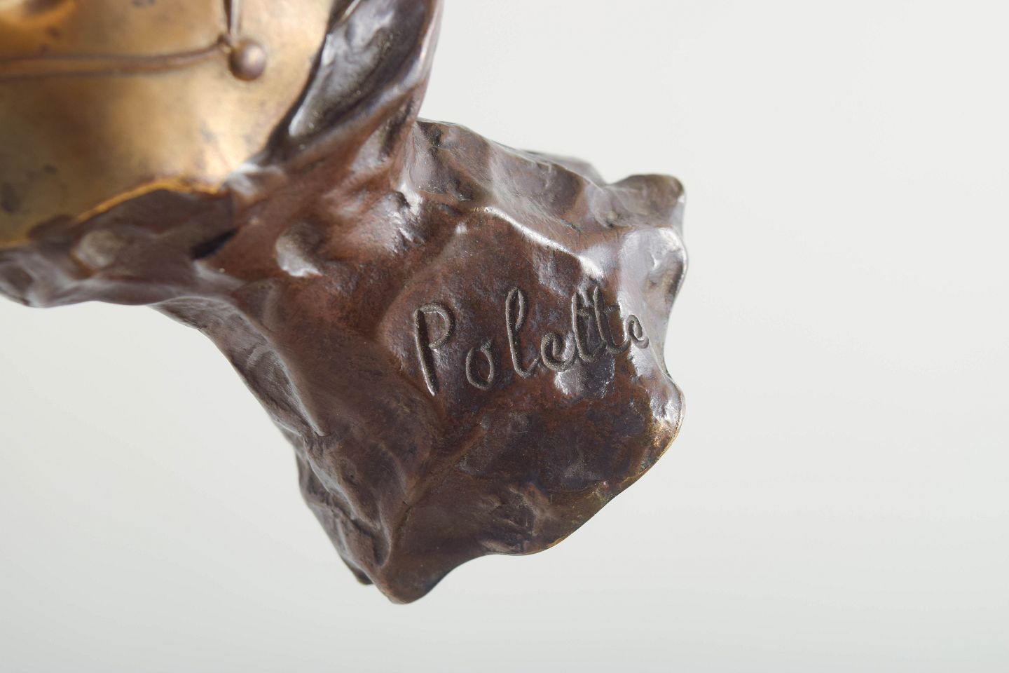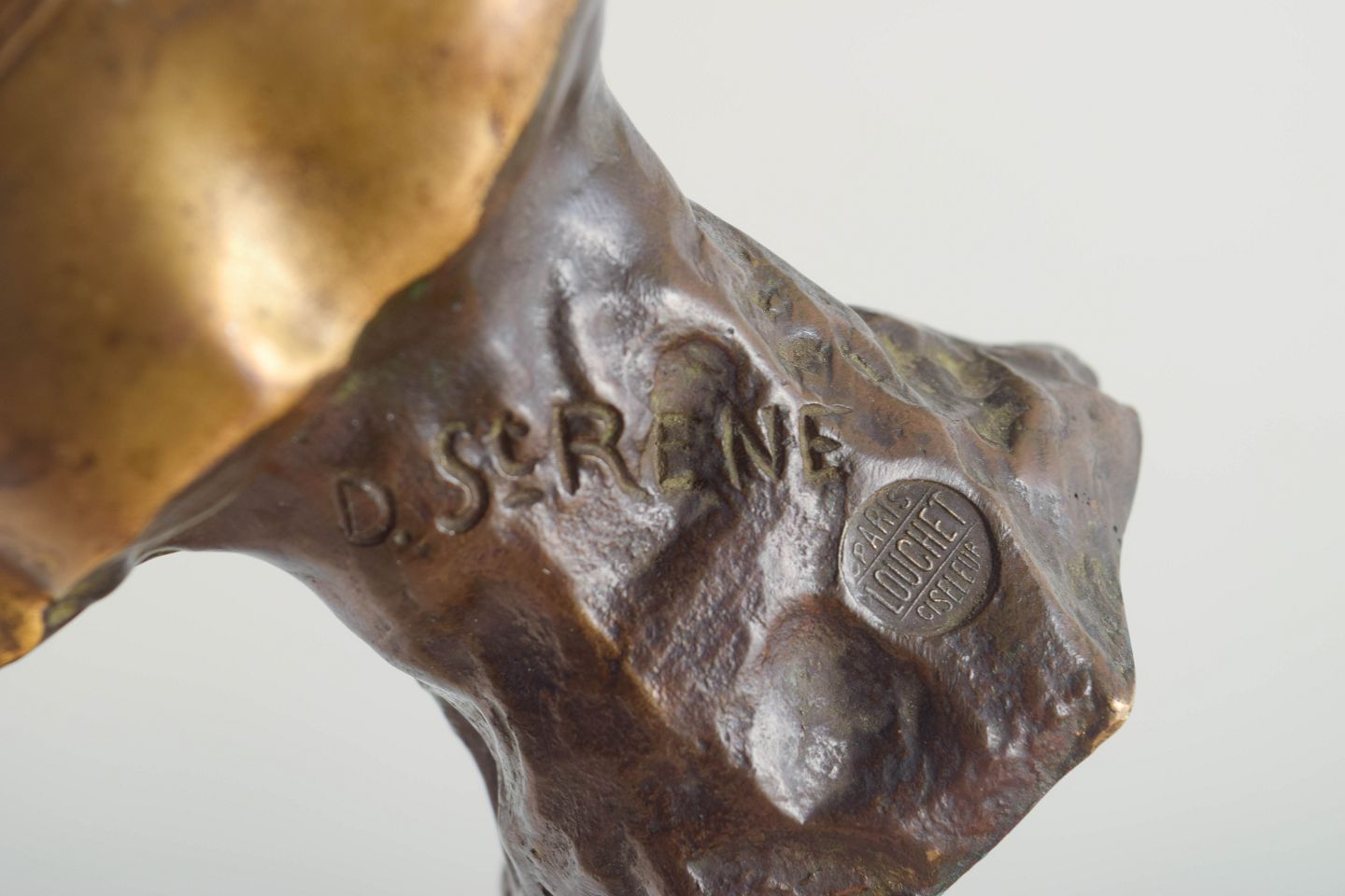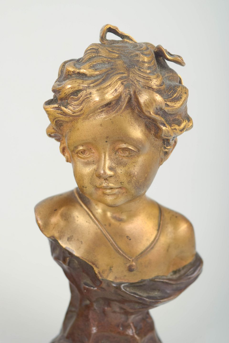 Figurativ buste i massivt bronze forestillende ung pige med let drejet hoved og blødt modellerede ansigtstræk. Støbt hos Louchet, Paris, i 1890’erne.