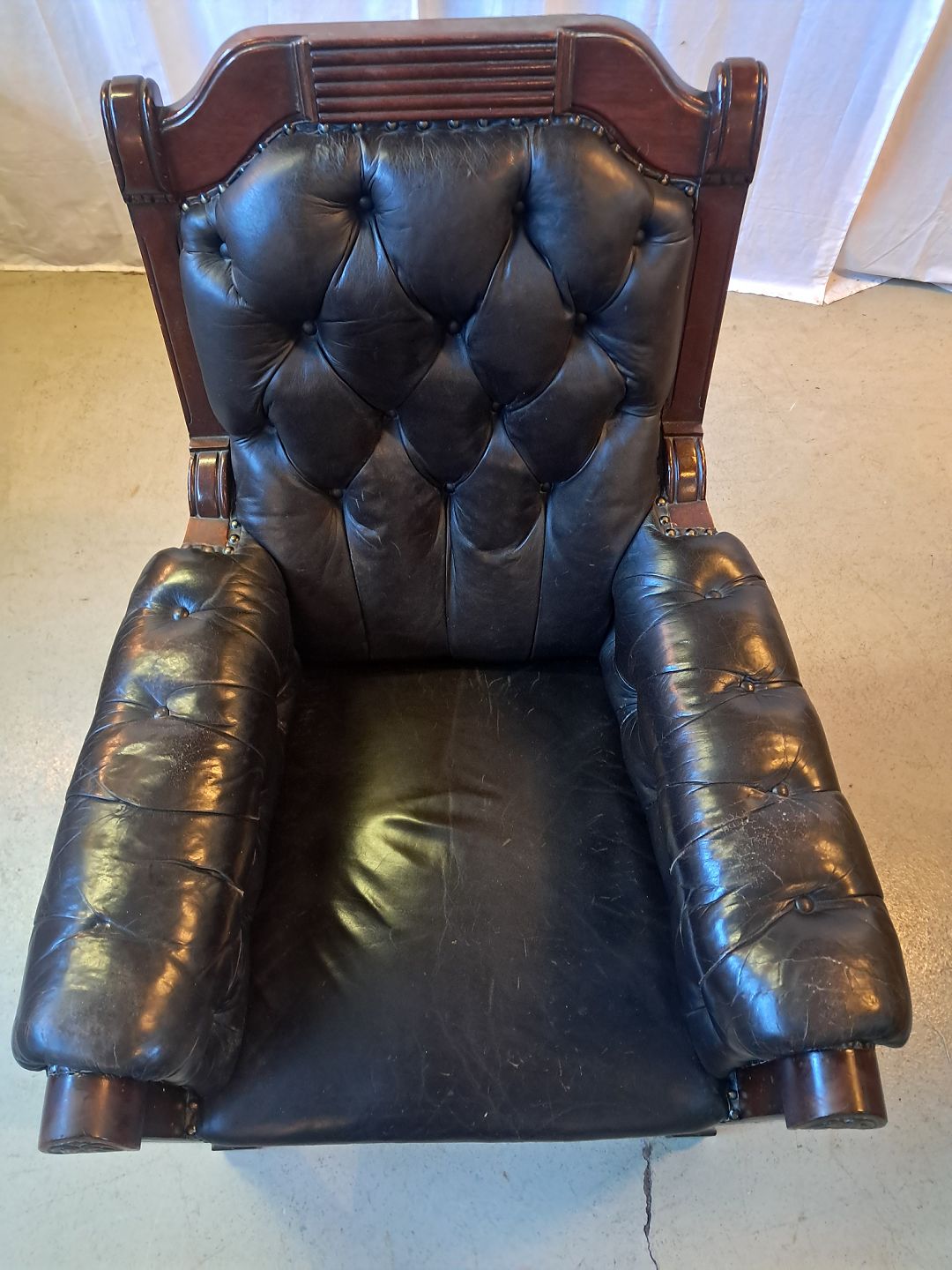 Lænestol i massivt mahogni med læderbetræk, fra 1910erne.