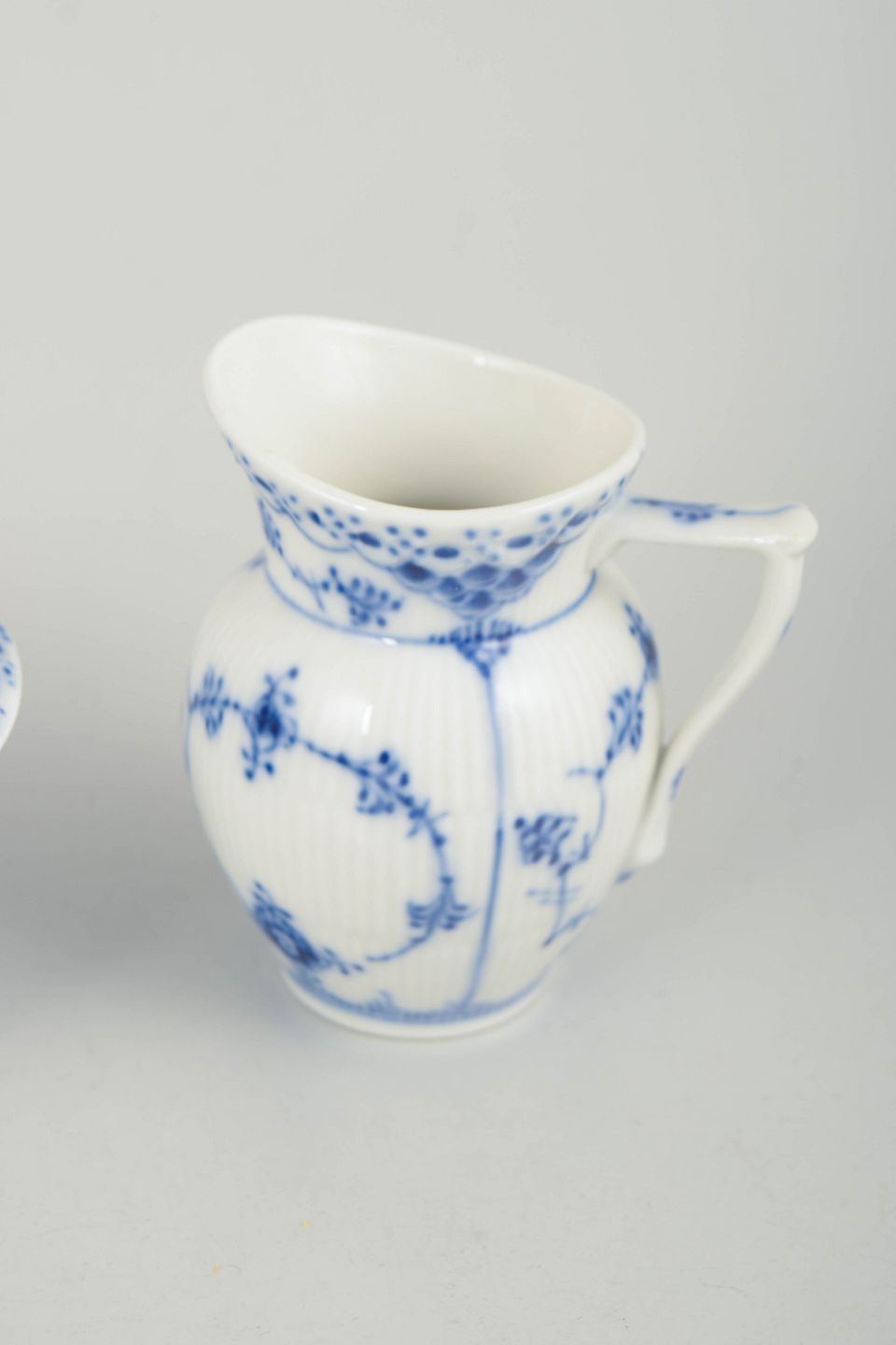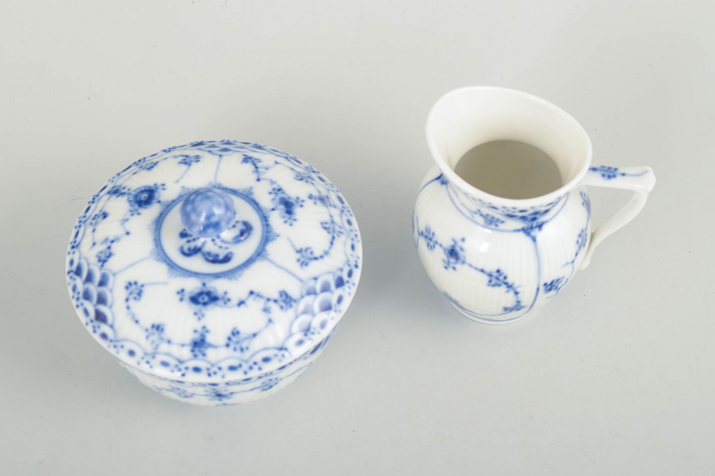 Sukkerskål med låg og flødekande i håndmalet porcelæn fra Musselmalet Halvblonde med klassisk underglasurdekoration i koboltblå, riflede felter og karakteristisk blondekant. Modeller 1/657 og 1/521. Første sortering. Fremstillet 1963.