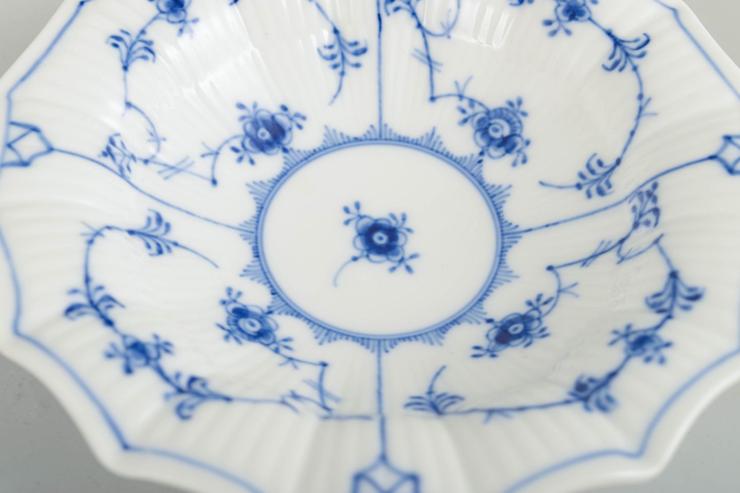 Skål i håndmalet porcelæn fra Musselmalet Riflet med klassisk underglasurdekoration i koboltblå og riflede felter. Model 1/140. Første sortering. Fremstillet 1958.