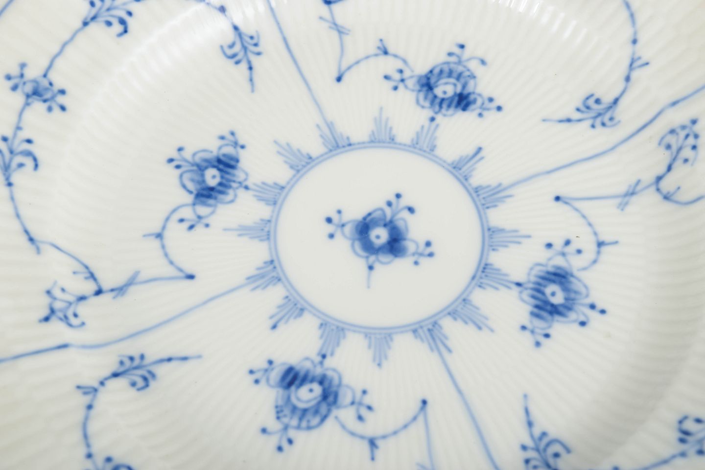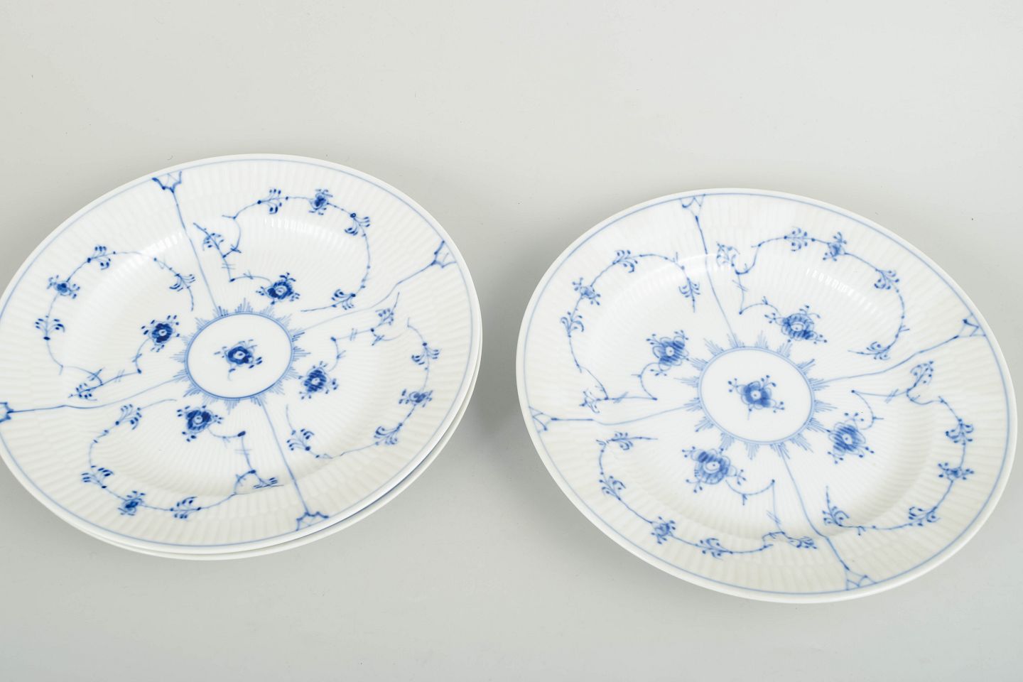 Royal Copenhagen Musselmalet Riflet, sæt af tre middagstallerkener.