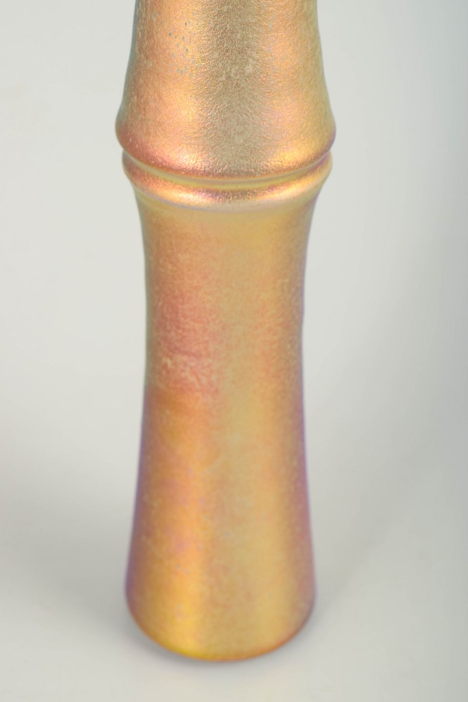 Slank og arkitektonisk udformet vase i stentøj med metallisk, iriserende glasur i gyldne og kobberfarvede nuancer. Vasen har markerede profilerede led og er signeret under bunden.