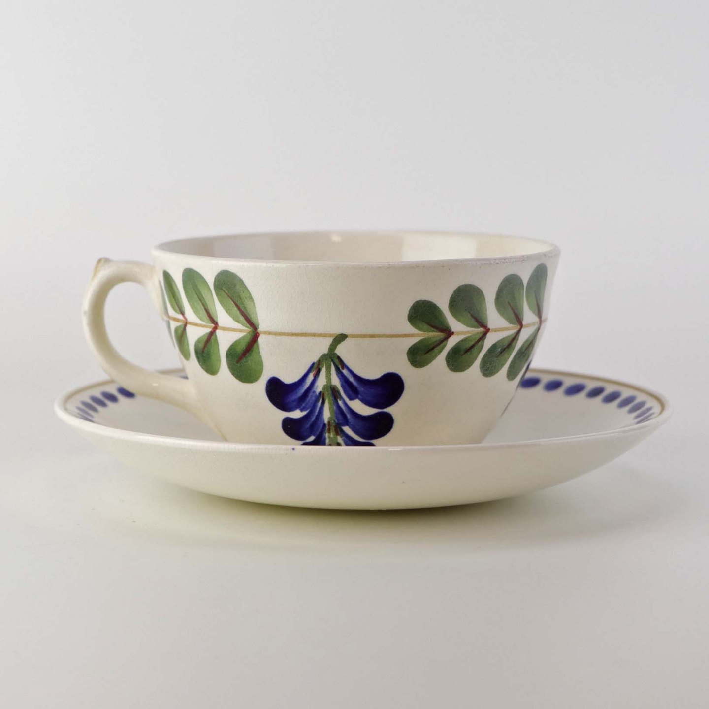 Tekop med underkop i fajance fra stellet Blåregn. Stellet er fremstillet i perioden år 1903-1933. Nr. 522/1756