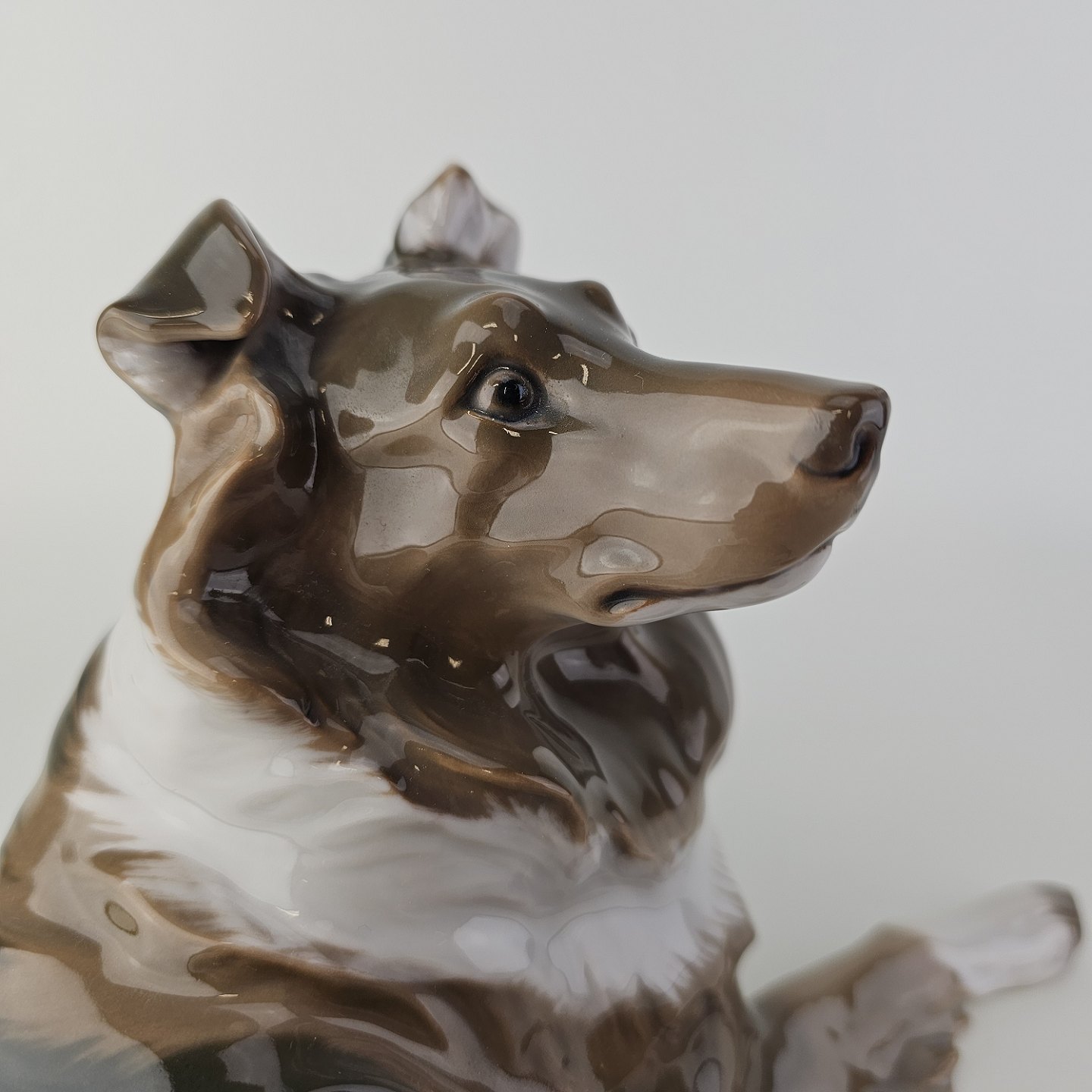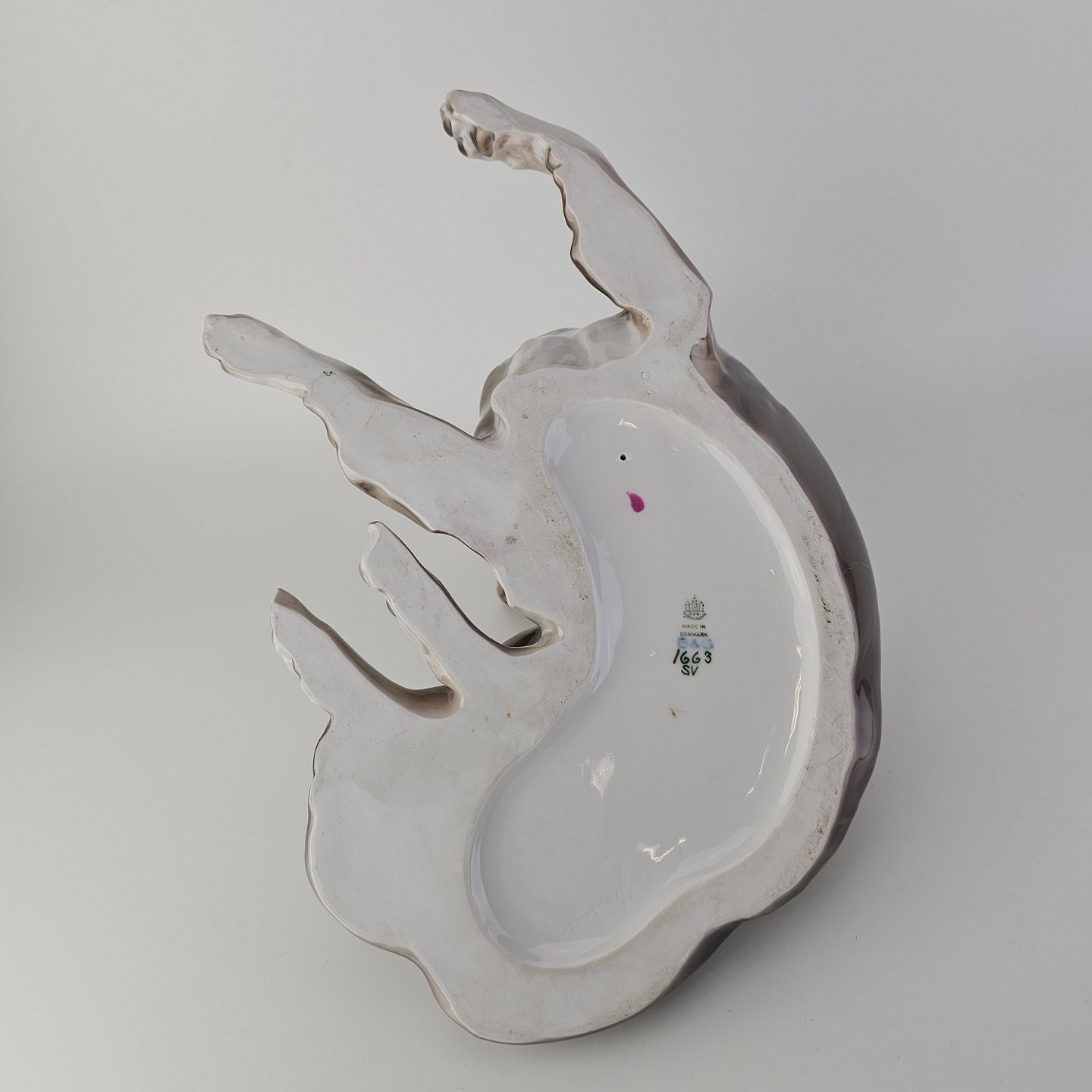 Figur i hvidt porcelæn med motiv af en liggende hund.