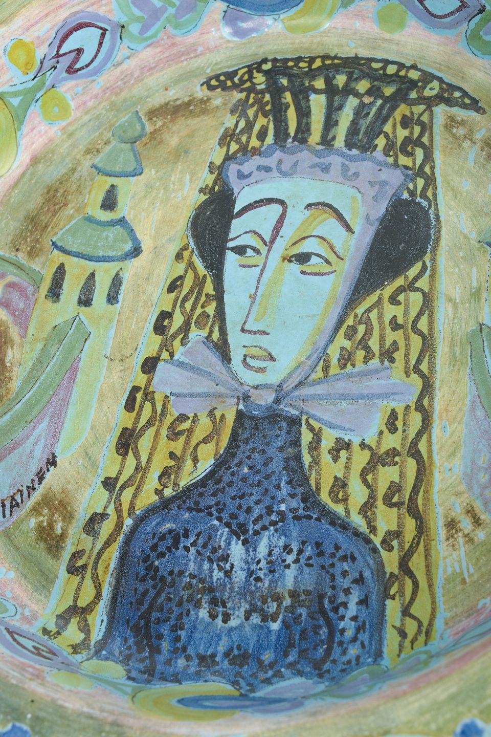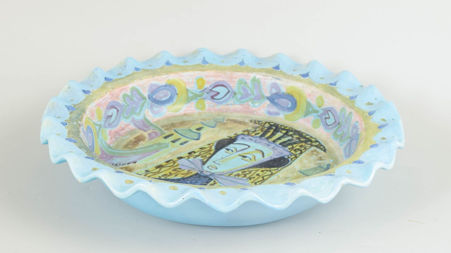 Stor hånddekoreret keramisk skål med bølget rand og polykrom dekoration forestillende stiliseret kvindefigur omgivet af ornamentale motiver.