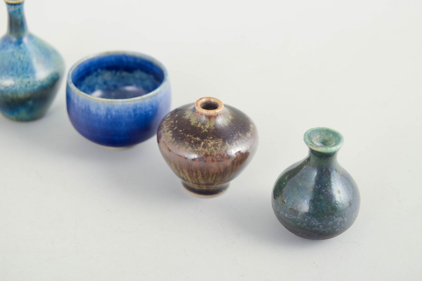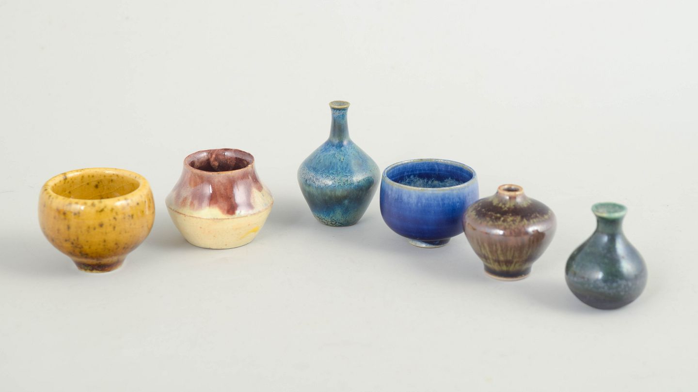 Samling af seks miniature keramikgenstande bestående af små skåle og vaser i forskellige former og glasurer. Fremstillet i keramik med flerfarvede glasurer i blå, brune og gule nuancer. Tre eksemplarer er fra Höganäs og andre fra forskellige producenter.