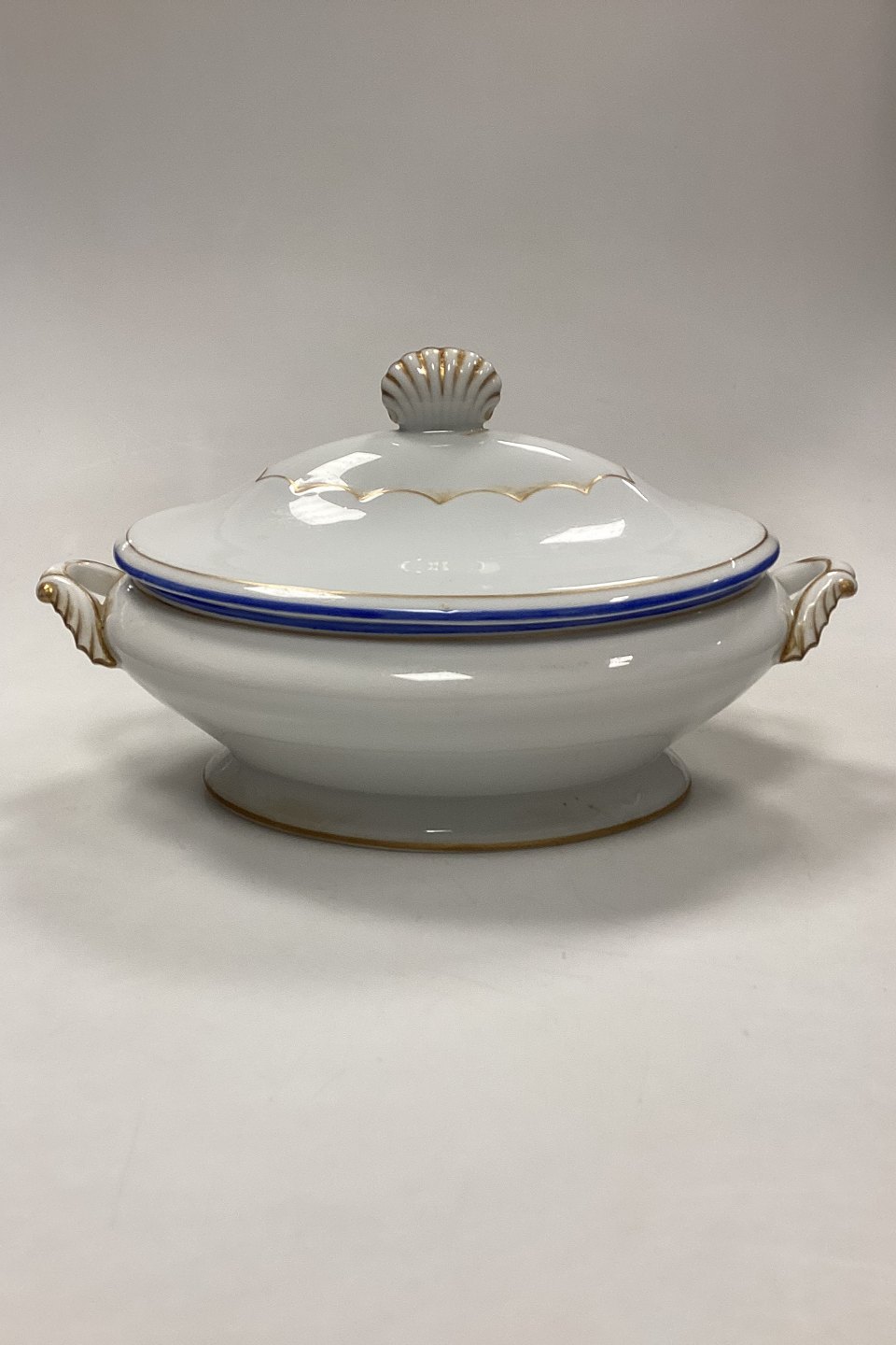 Royal Copenhagen Terrin med Underfad No. 282/9058. Hvidt porcelæn med dekoration i guld og koboltblå. Lettere slid på guld og kanter.
