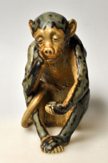 Bing & Grøndahl figur, 20. årh. København, Danmark: En abe med en skildpadde. No. 1510. Stentøj. Sung glasur. Stemplet. H.: 13,5 cm. Design:: Dahl Jensen. 1. Sortering.