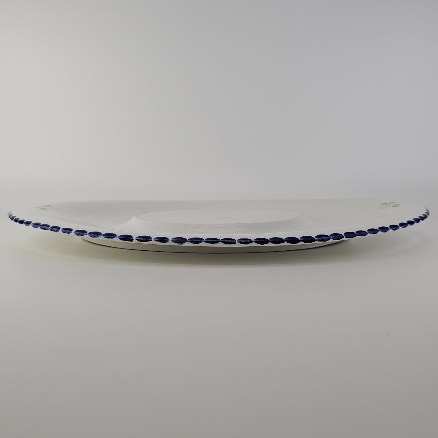 Hvidt fajancestel i stelform Sterling med motiv af blå blomster og blå prikker på kanten.