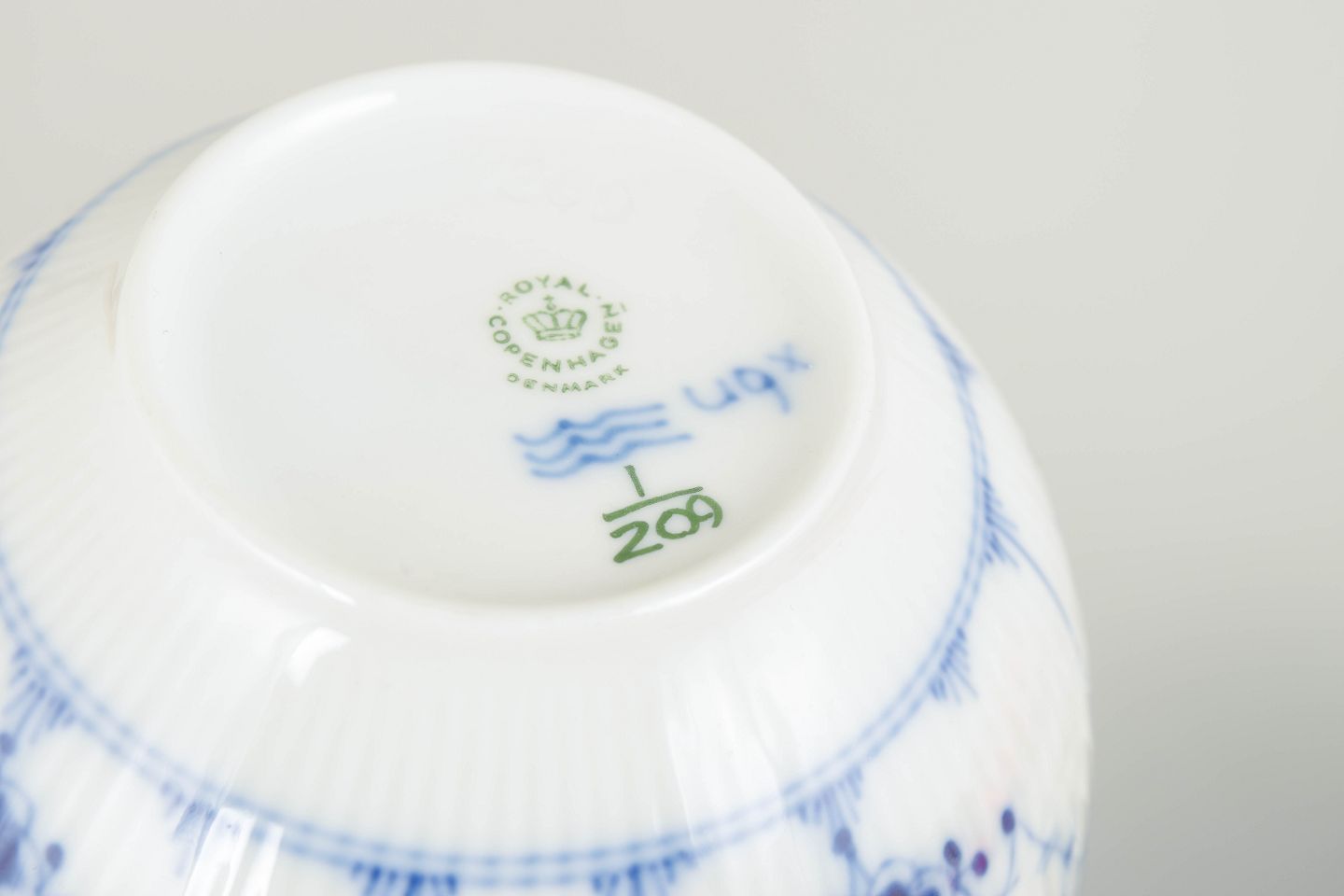 Royal Copenhagen blev grundlagt i 1775 i København under kongelig bevilling. Fabrikken er internationalt anerkendt for sit håndmalede porcelæn og sit høje kunstneriske niveau. Musselmalet Riflet er fabrikkens mest klassiske stel, introduceret i slutningen af 1700-tallet og fortsat produceret med traditionelle håndværksmetoder.