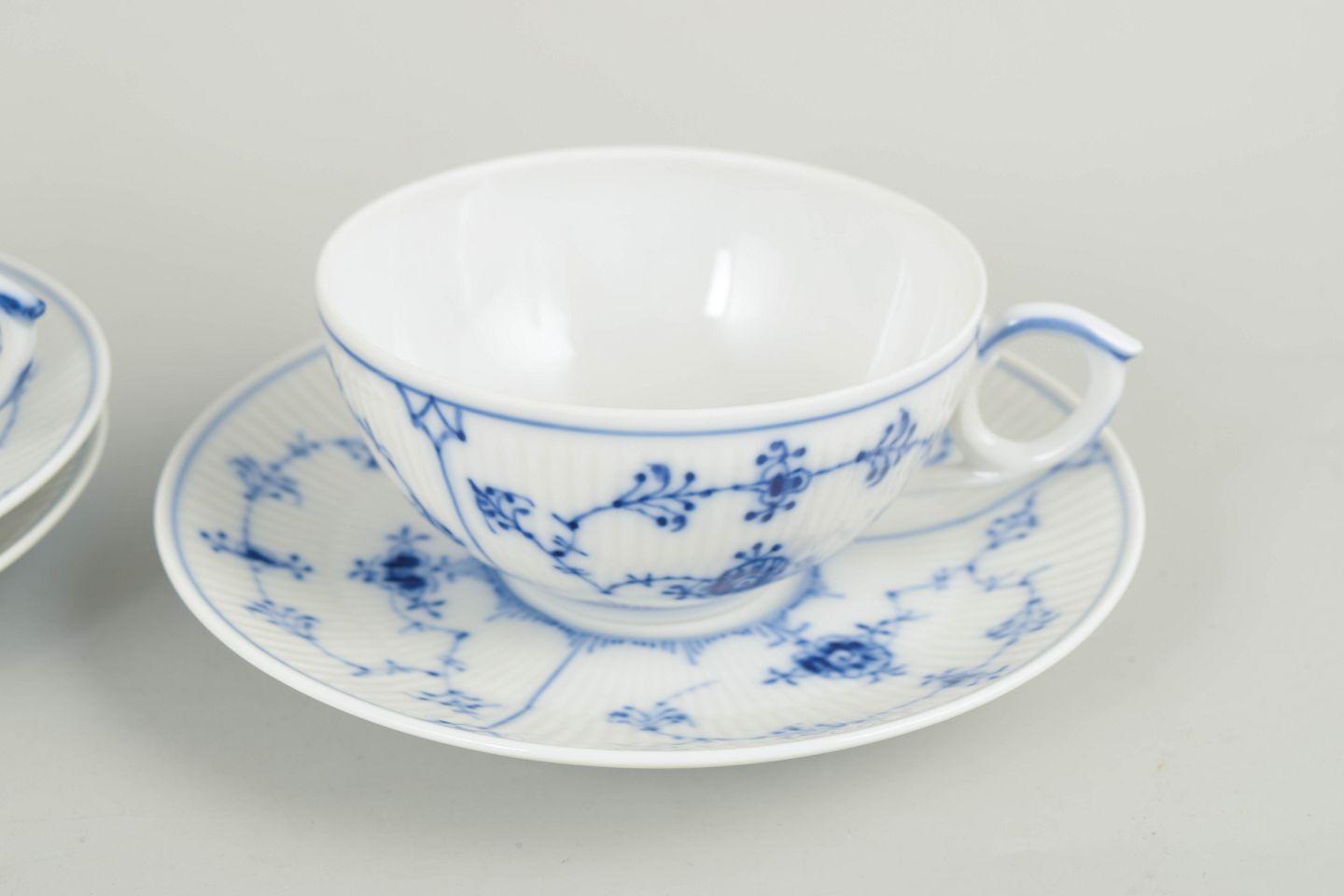 Royal Copenhagen Musselmalet Riflet sæt af tre tekopper med tilhørende underkopper.