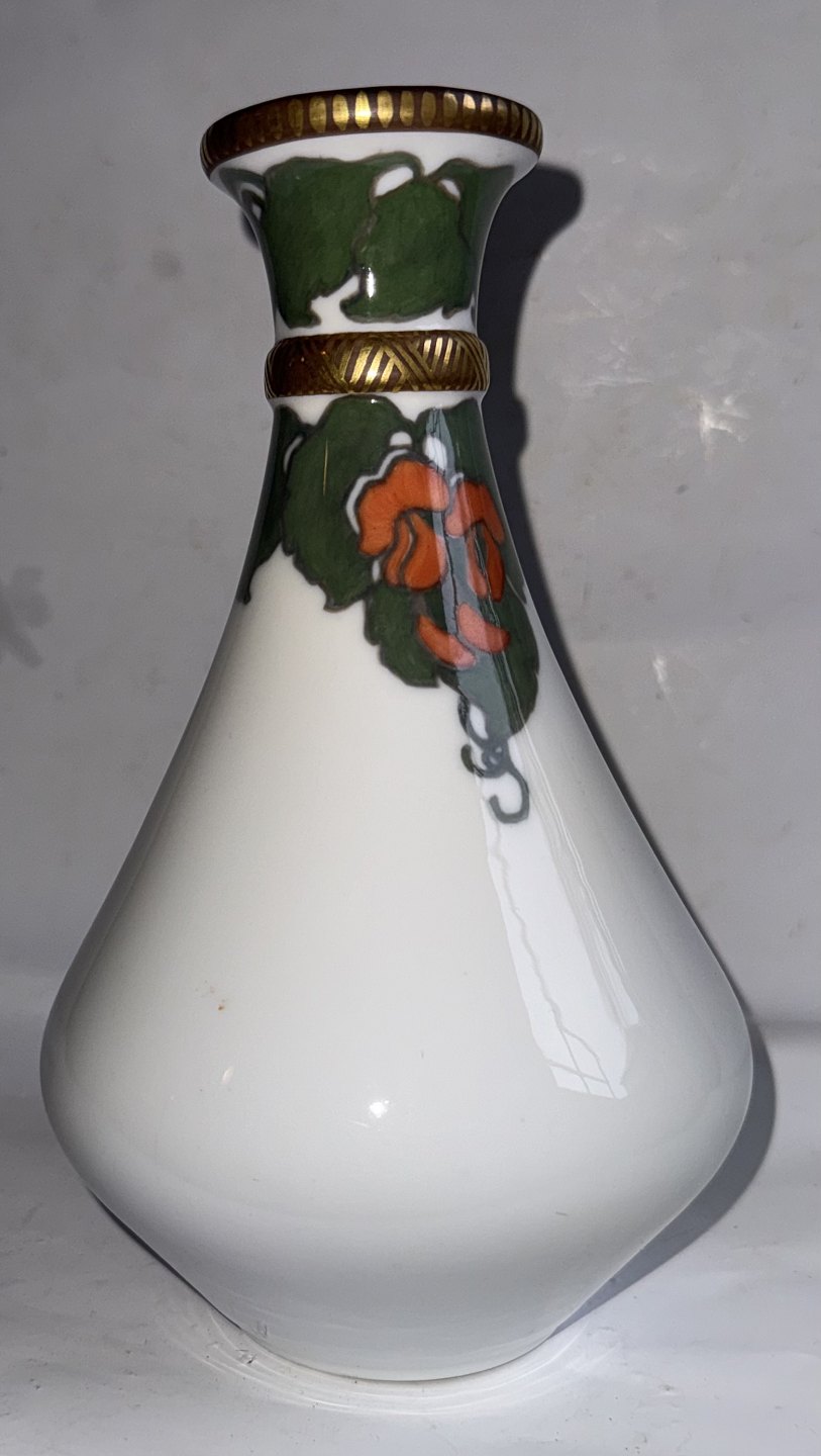 Art Nouveau vase i porcelæn fra Royal Copenhagen med smuk og farverig dekoration med bl.a. guld, oberst på vasen. Fremstår i perfekt stand. 1. Sortering. Fabriksmærket på bunden. Fremstillet mellem 1900-1923. Mål: H. 20,5 cm