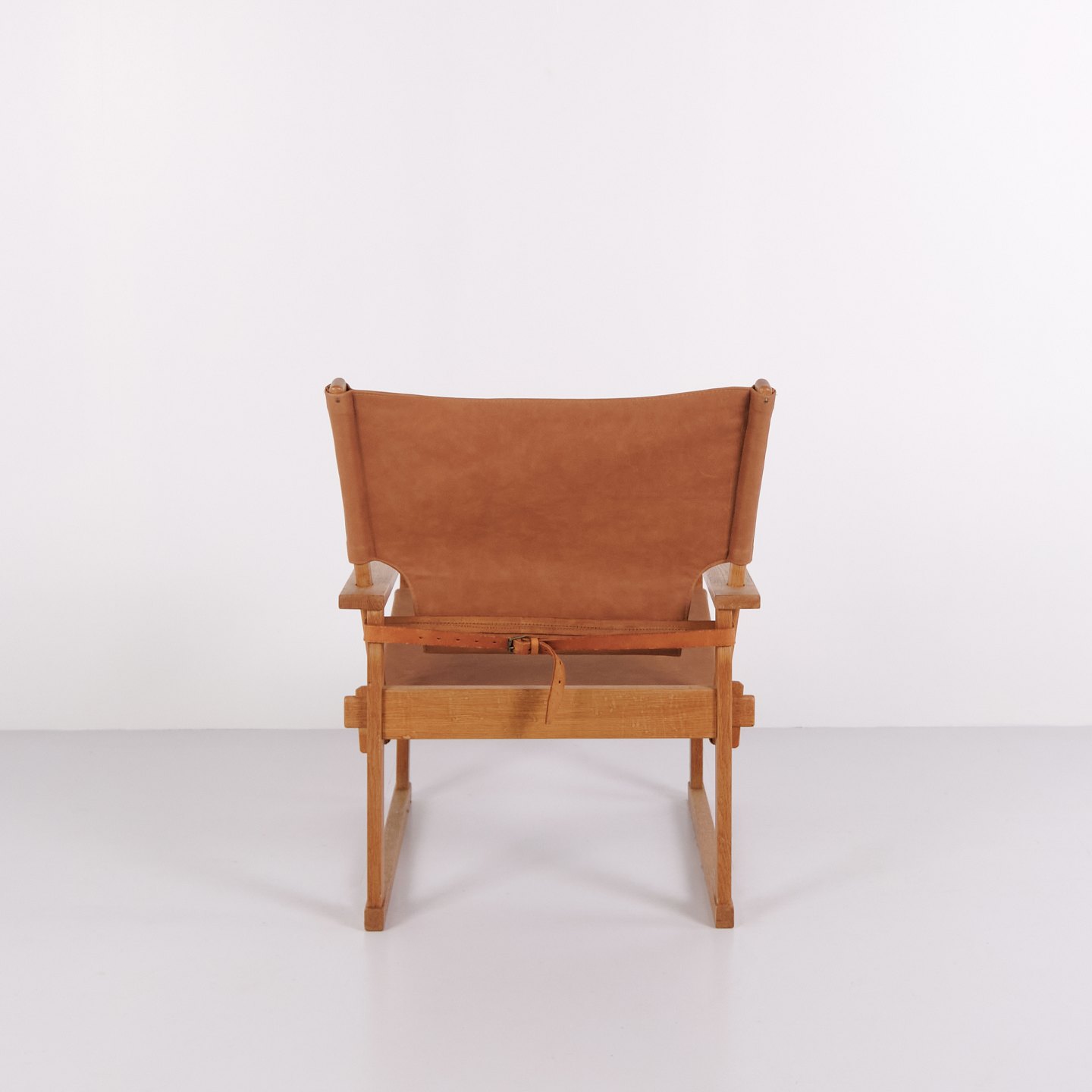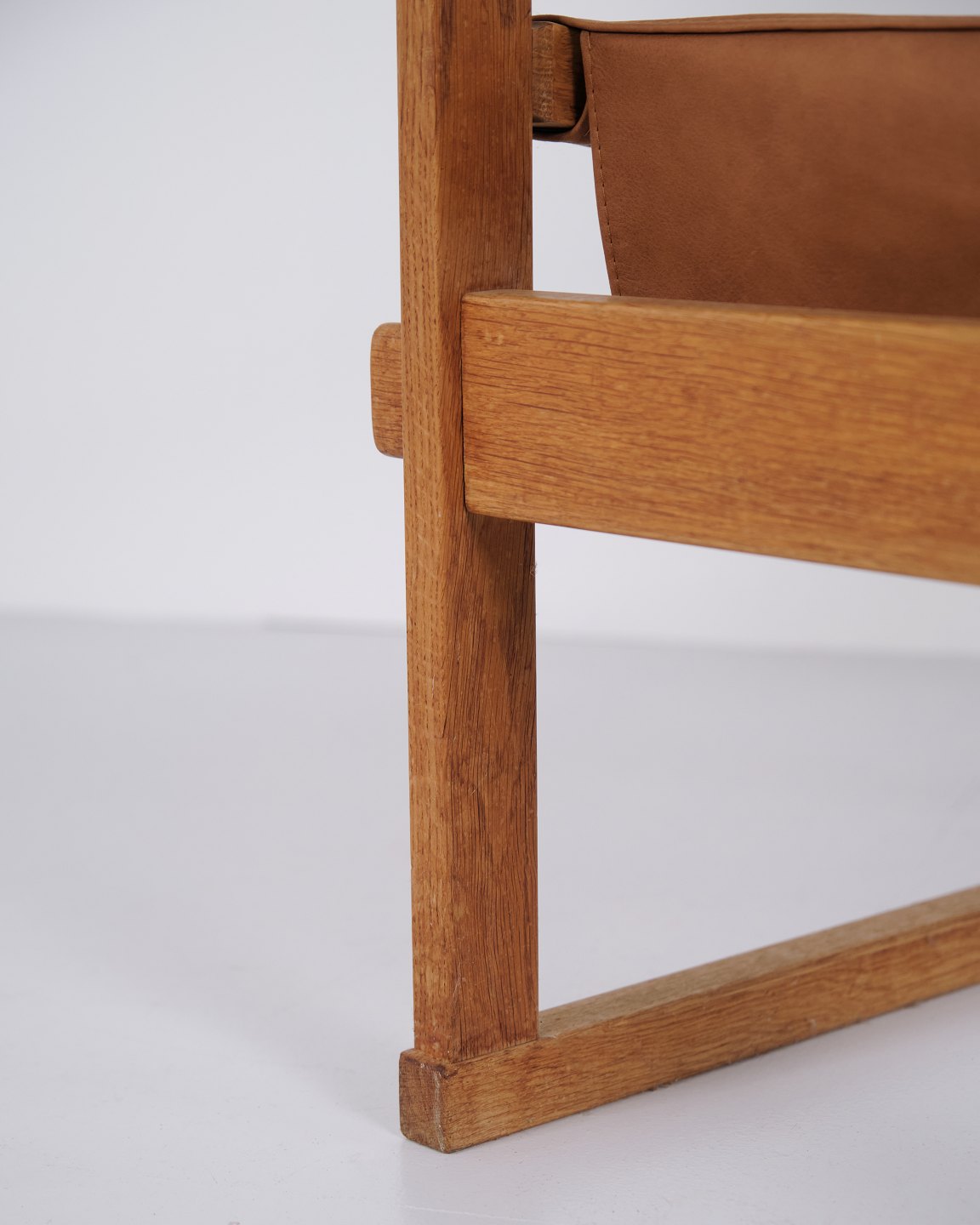 The design is characterized by a sturdy construction and clean lines, typical of Danish furniture design from the early 1960s. The combination of oak and saddle leather highlights the chair’s craftsmanship and comfort.