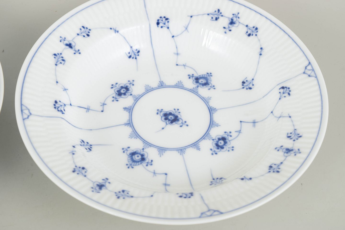 To håndmalede dybe suppetallerkener i Musselmalet Riflet dekoration, model 1/165, fra 1920’erne. Første sortering.