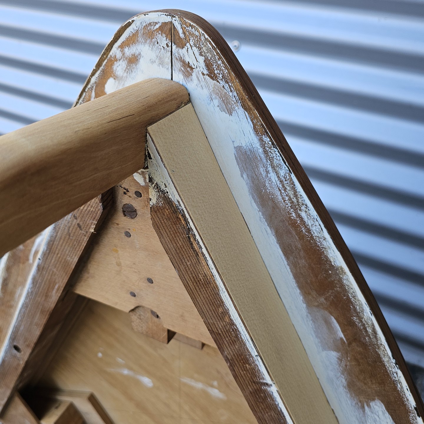 Trekantet sofabord med stel i bøg og bordplade i teaktræ