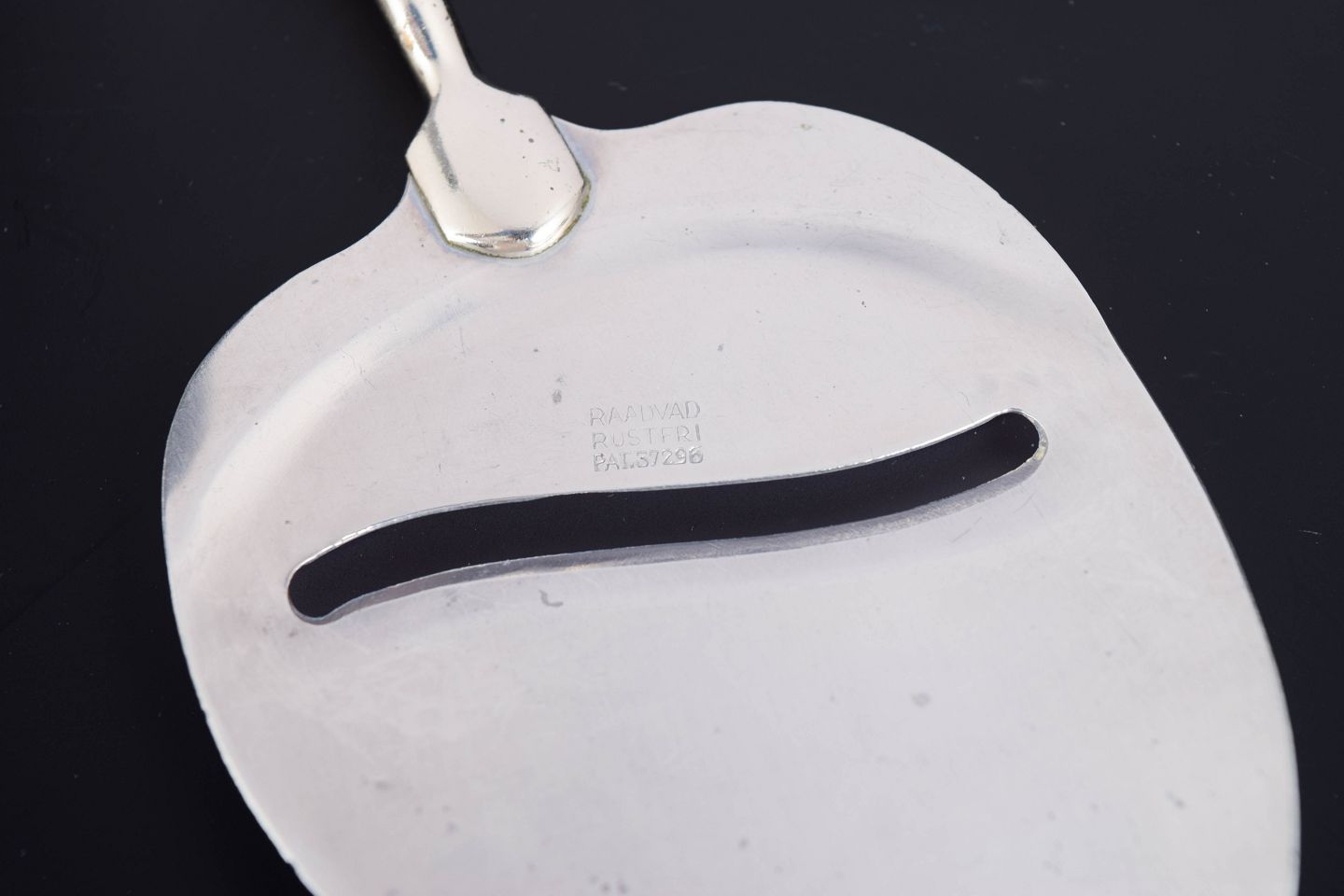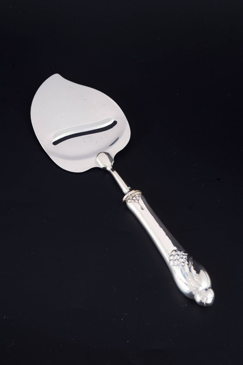 Art deco ostehøvl i tretårnet sølv og rustfrit stål. Model nummer 6 med dekorativt skaft i relief med stiliseret blomstermotiv. Fremstillet hos Evald Nielsen.