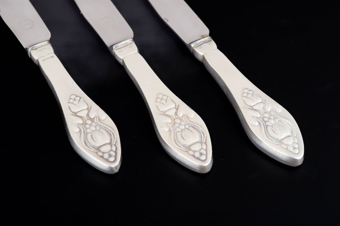 Sæt af tre frugtknive i rustfrit stål og sterlingsølv i mønstret Klokke fra Georg Jensen. Skaftet er dekoreret med et stiliseret blomstermotiv inspireret af fuchsiaen, udført i relief med bløde organiske linjer, karakteristisk for Georg Jensens tidlige jugendstil.
