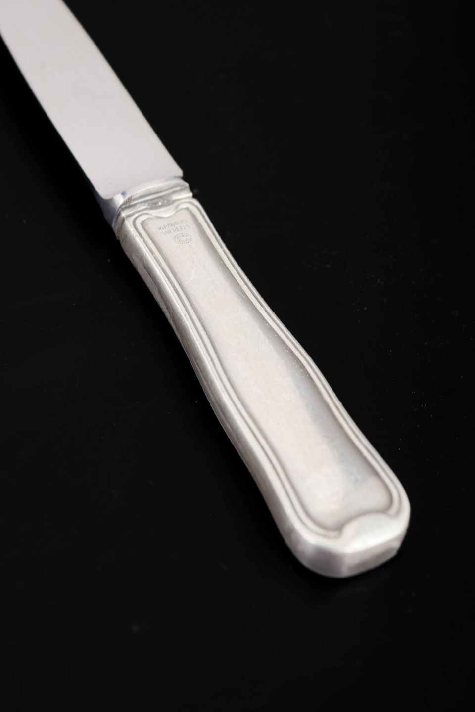Rejsekniv i rustfrit stål og sterlingsølv med skaft i mønstret Dobbeltriflet. Kniven har et slankt blad i rustfrit stål og et elegant sølvskaft med de karakteristiske dobbelte rifler langs kanten, et klassisk design fra Georg Jensen.