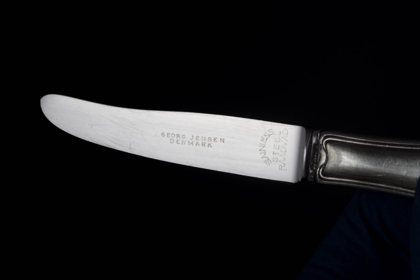 Text zugänglich auf Dänische: Georg Jensen, rejsekniv, Dobbeltriflet.
