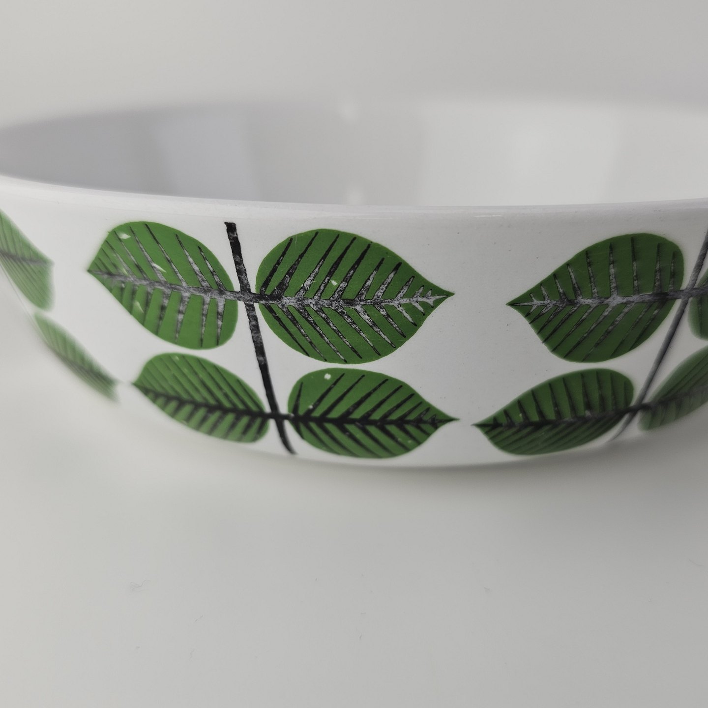 Stel i hvidt porcelæn med dekoration af grønne blade.