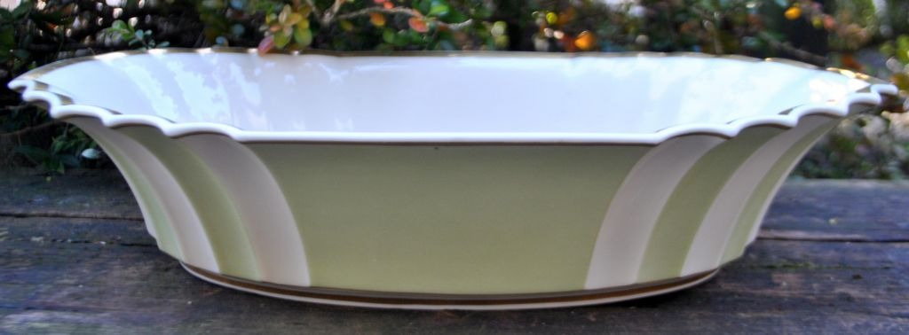 Royal Copenhagen jardiniere 988/3384, 20. årh. København, Danmark. Cremefarvet med grøn fond og forgyldninger. Stemplet. H: 9,3 cm. L: 37,5 cm. B: 19,5 cm.