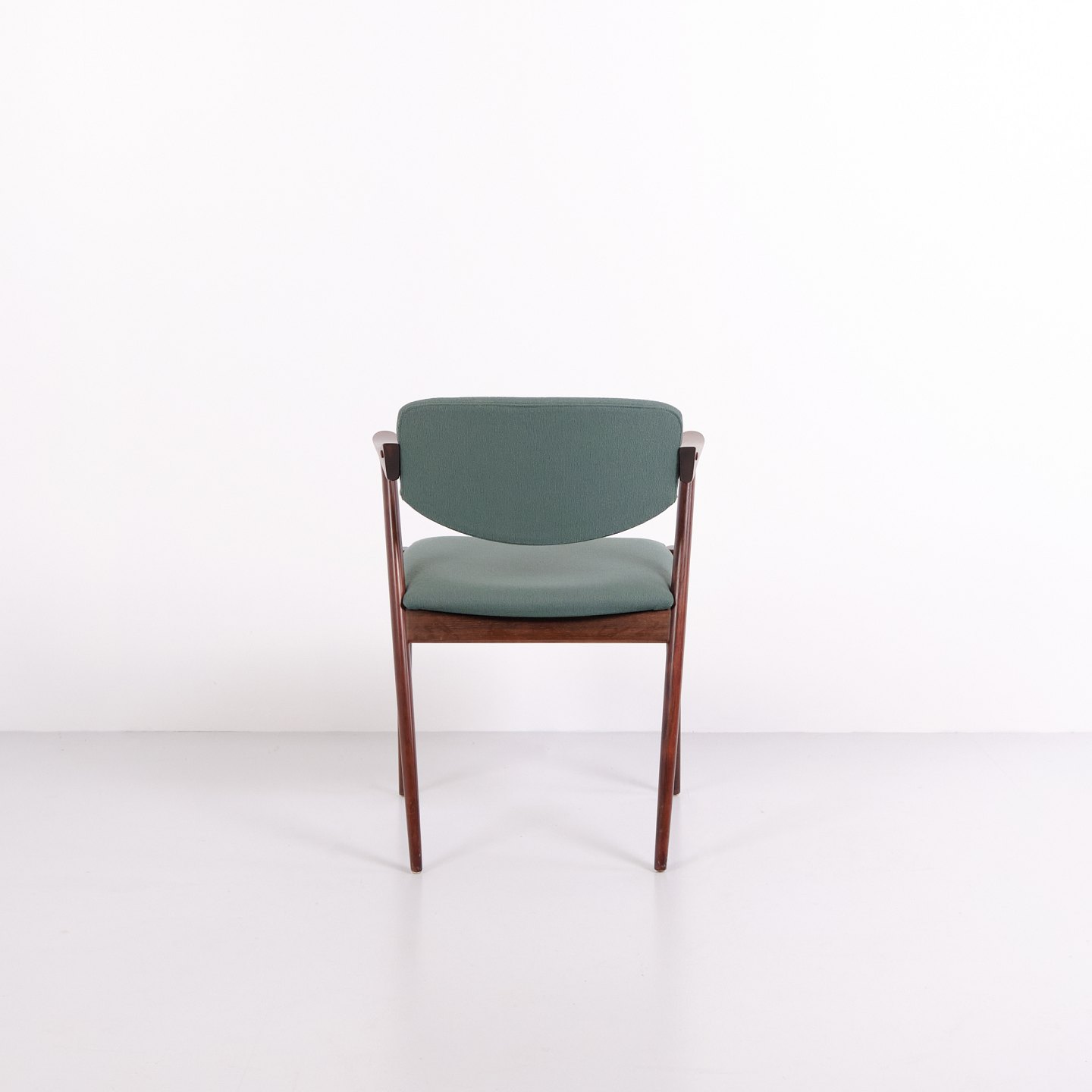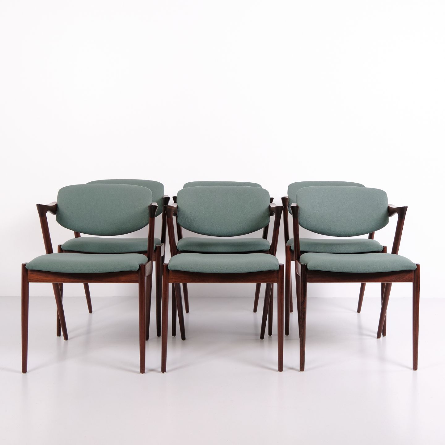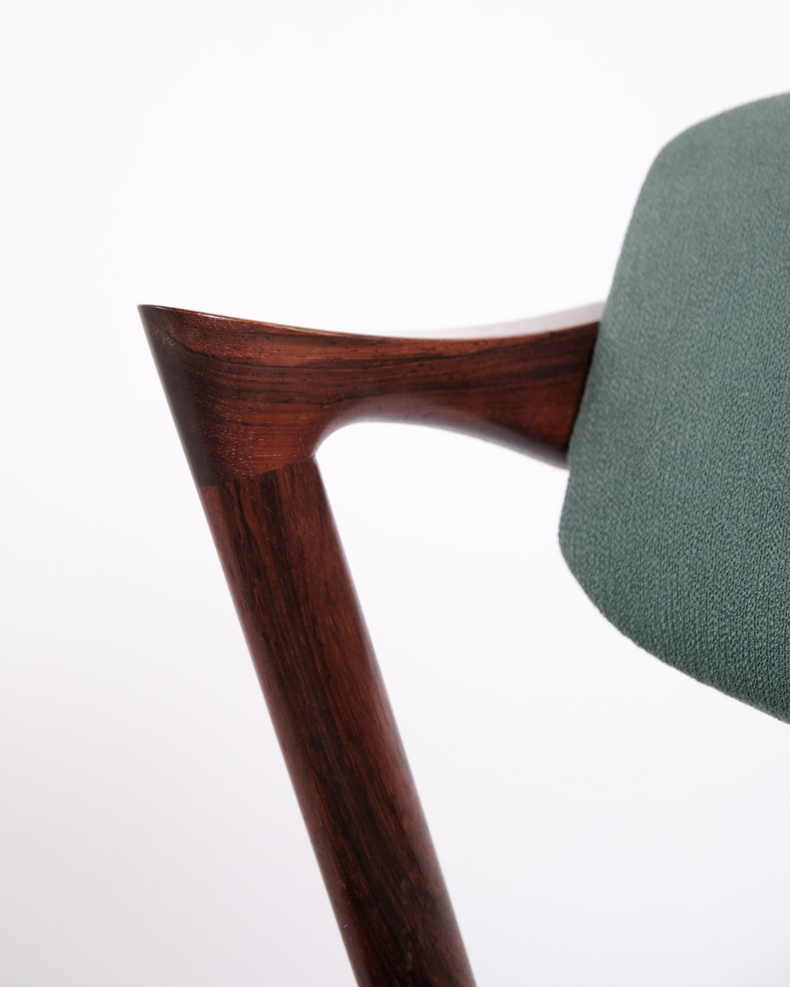 Sæt spisebordsstole, model 42, designet af Kai Kristiansen i 1960’erne. Stolene er udført i palisander og er kendetegnet ved deres elegante proportioner, skulpturelle ryg og karakteristiske danske snedkerdetaljer. Model 42 er et markant eksempel på dansk møbeldesign fra midten af det 20. århundrede.