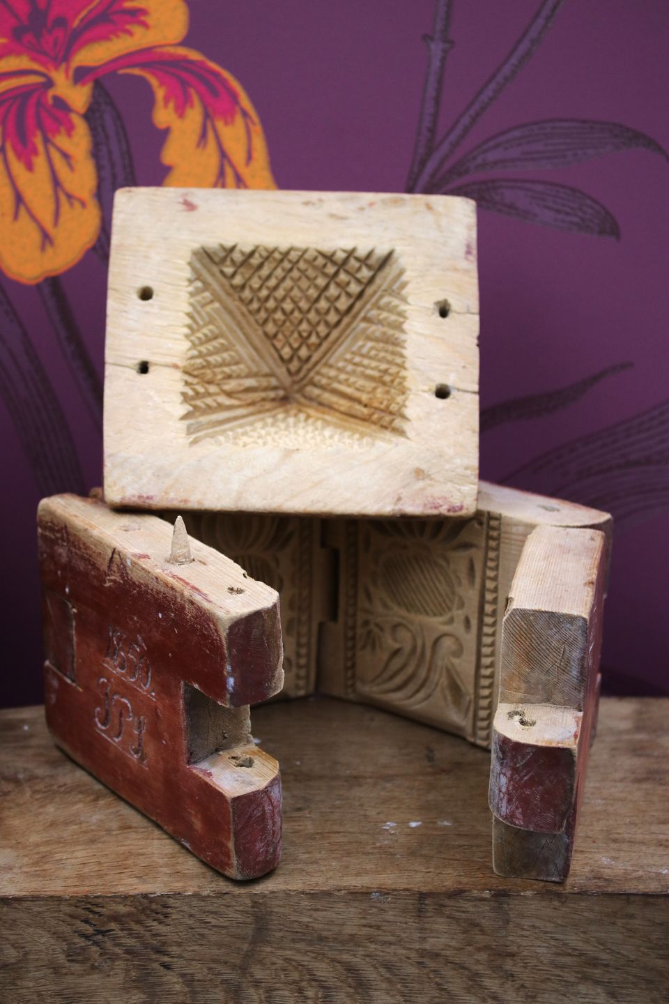 Smørformen blev brugt til at forme og dekorere smørklumper , når de skulle serveres ved festlige lejligheder. H: 17,5cm. 13x13cm.