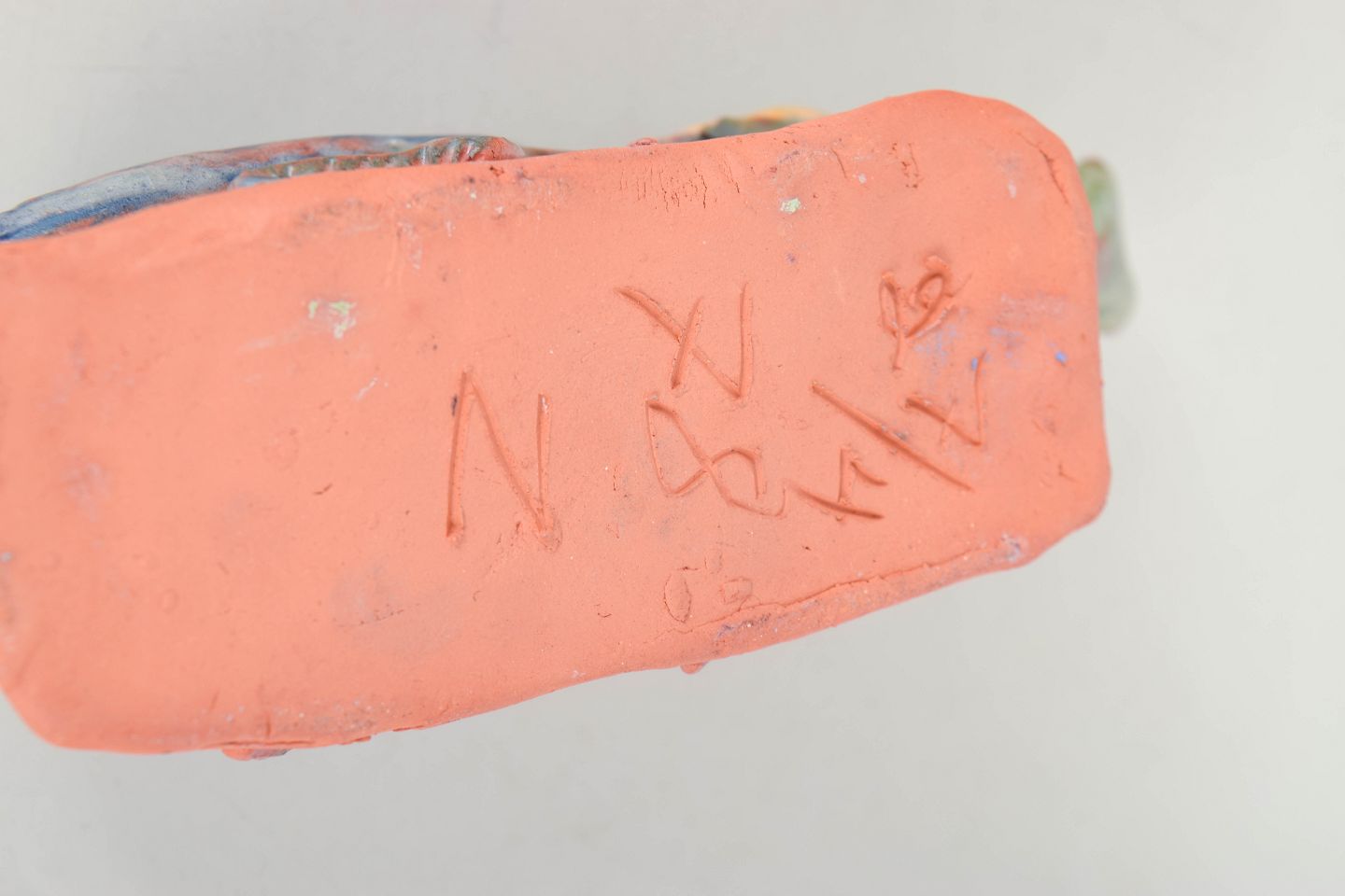 Unik keramisk figur forestillende et insekt udført i stentøj med flerfarvet glasur i grønne, blå og brunlige nuancer. Figuren er modelleret med naturalistiske detaljer og placeret på en lille base i ler, hvilket giver et skulpturelt og levende udtryk. Signeret og dateret 1978.