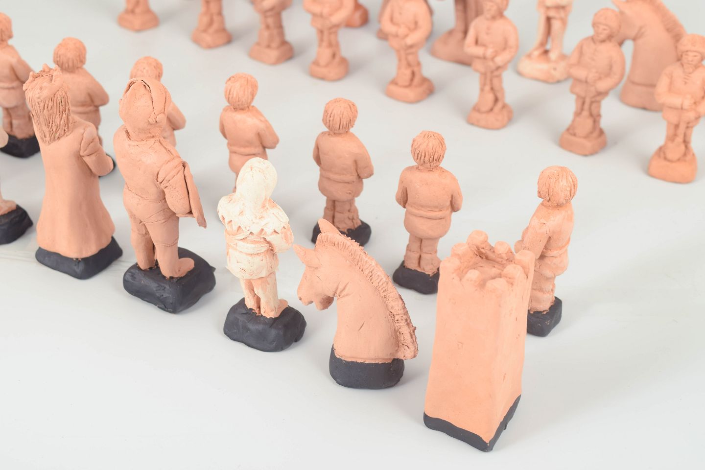 Unikt keramisk skaksæt bestående af toogtredive håndmodellerede figurer udført i uglaseret ler. Figurerne er udformet som stiliserede menneskefigurer og skulpturelle former, hver med individuelle karaktertræk og detaljer. Flere af figurerne er signerede. Sættet fremstår som et kunstnerisk fortolket skakspil med tydelig skulpturel karakter. Fremstillet i 1959.