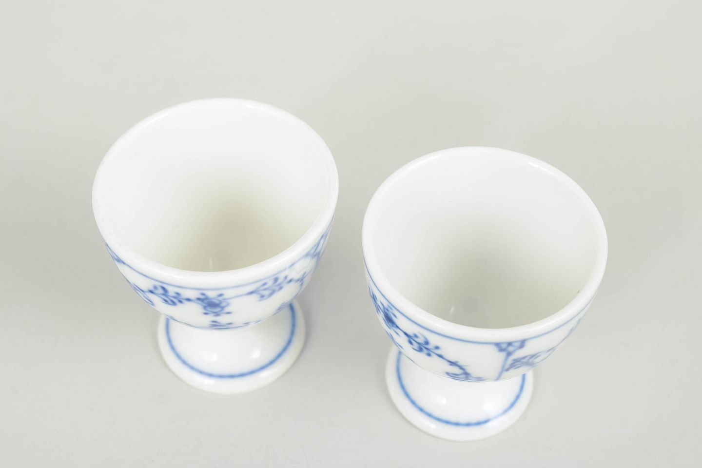 Sæt af to håndmalede æggebægre i porcelæn dekoreret med det klassiske musselmalede riflet mønster i blå underglasur. Æggebægrene har rund skålformet overdel og lille fod, dekoreret med de karakteristiske blomsterornamenter og slyngede blomstergrene fra serien. Undersiden er fabriksstemplet Royal Copenhagen, første og anden sortering. Model 1/2026.