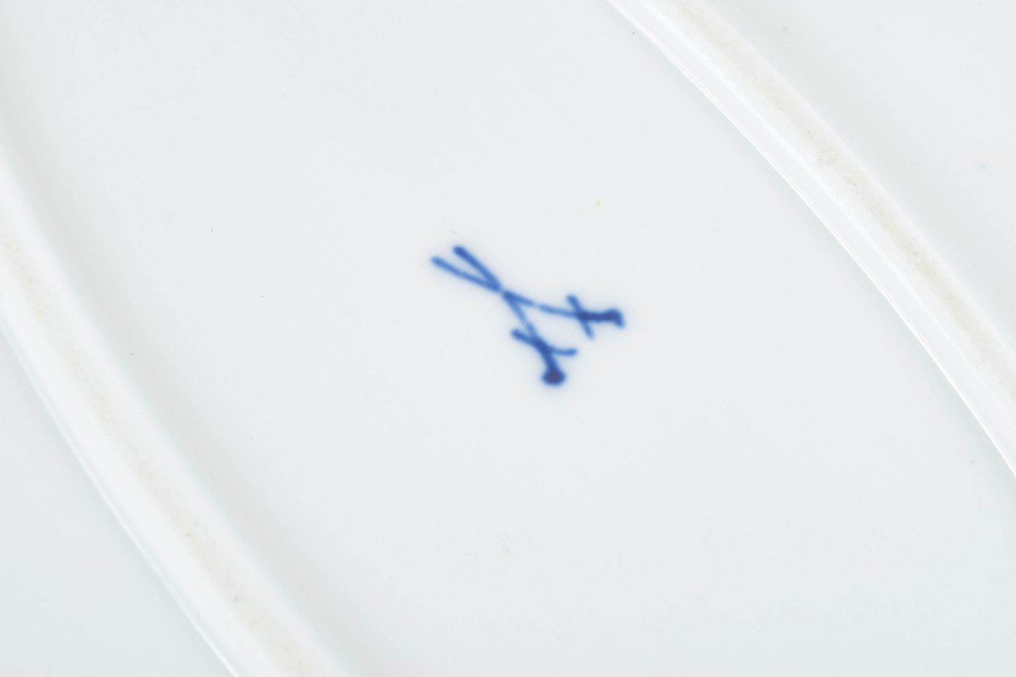 Stort ovalt serveringsfad i porcelæn dekoreret med det klassiske håndmalede løgmønster i koboltblå underglasur. Formen har en elegant svungen fane med kontureret rand og en central blomsteropsats omgivet af stiliserede blomster- og frugtmotiver. Modellen blev fremstillet hos Meissen i begyndelsen af 1900-tallet og er mærket på undersiden med de karakteristiske krydsede sværd, annulleret med to indridsede streger.