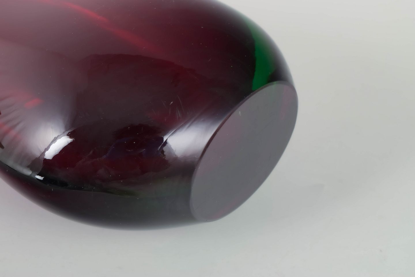 Elegant kunstglasvase i klart glas med indkapslet rød kerne og grøn tone i bunden samt meget lang slank hals, udført i karakteristisk Murano-stil med skulpturel dråbeform.