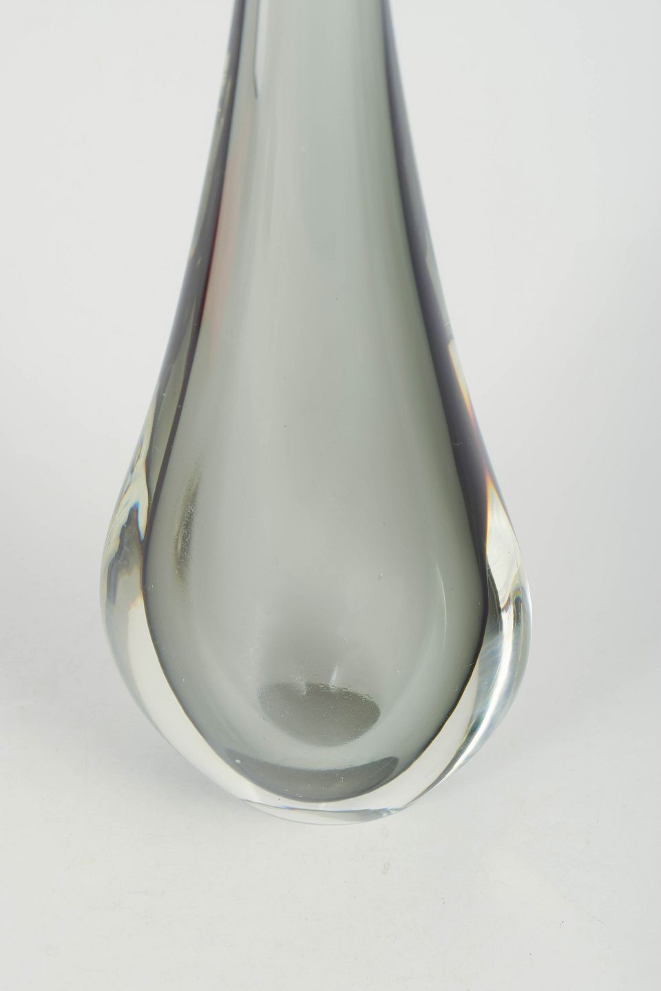Slank kunstglasvase i klart glas med elegant dråbeformet silhuet og lang smal hals, udført i karakteristisk Murano-stil med tung bund og raffineret form.
