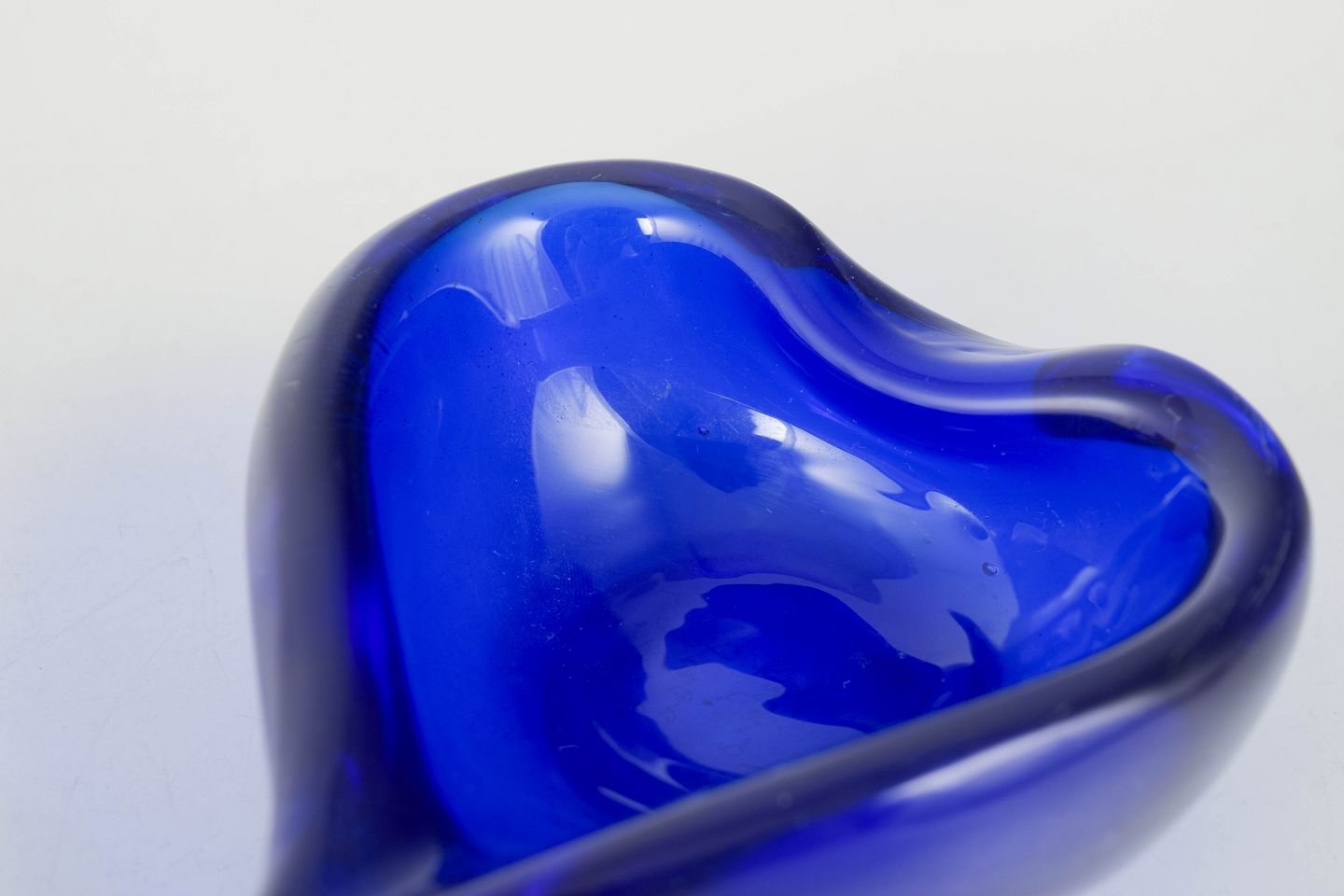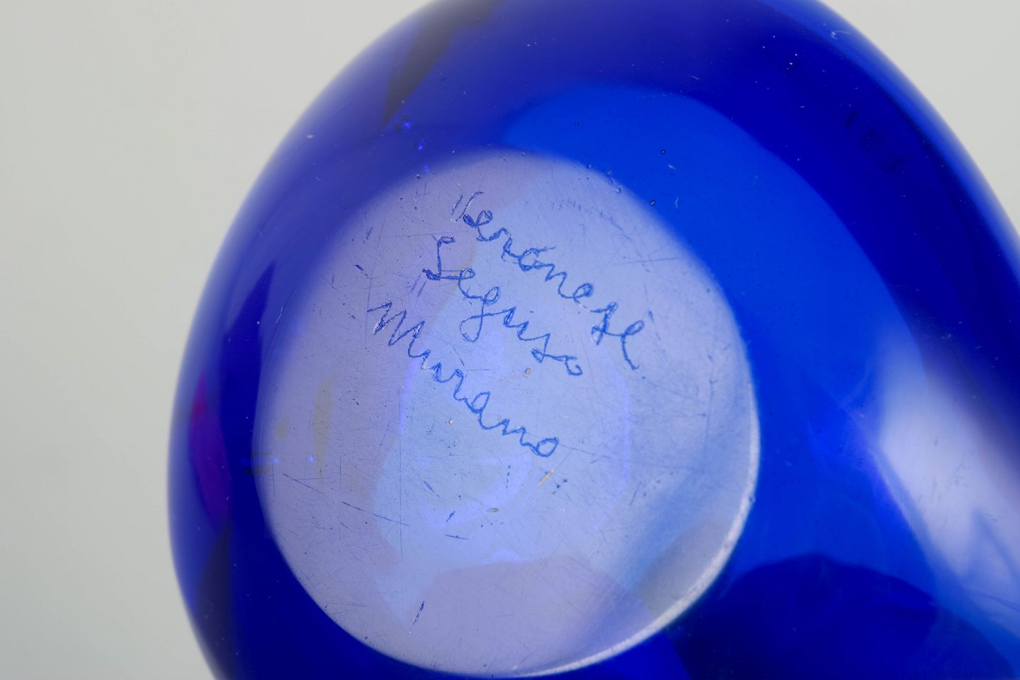 Lille organisk formet kunstglasskål i dyb koboltblå glas med blødt bølgende kant. Signeret “Veronese Seguso Murano” under bunden.