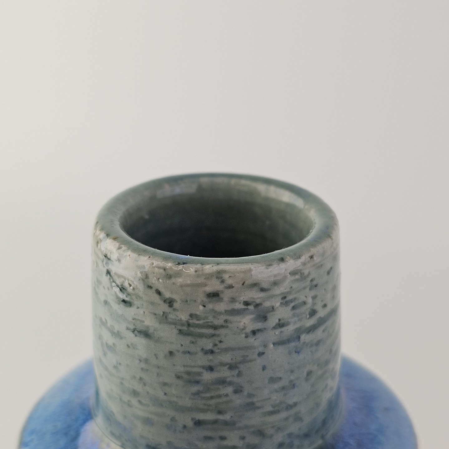 Rund vase i blåt glaseret stentøj med geometrisk mønster
