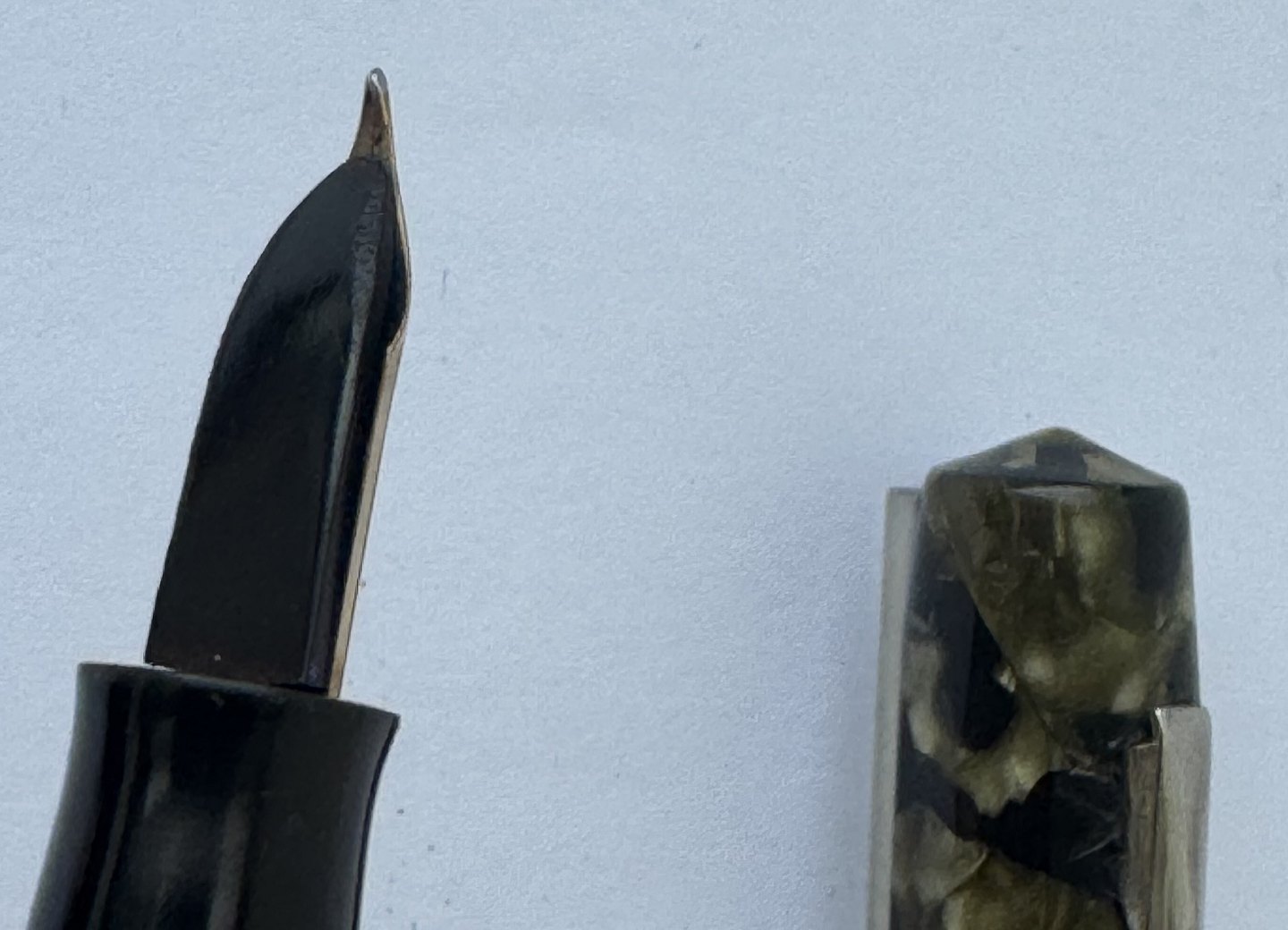 REN ART DECO STIL: 10 kantet og grøn marmoreret Miller nr. 697 fyldepen fra omkring 1940. I god stand uden skader eller reparationer. Alle dele originale til denne model inklusive en 14 karats guldspids (ca. 0,30 gram). Ny gummisæk skal indsættes før den igen kan optage blæk og skrive påny. Ny gummisæk kan indsættes for et tillæg på kr. 250,00. Fyldepennen er 12,3 cm lang.